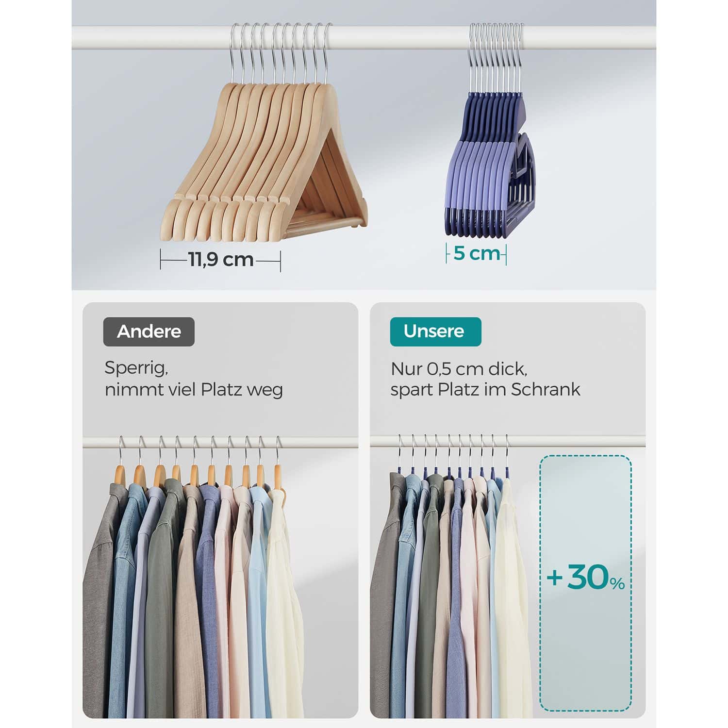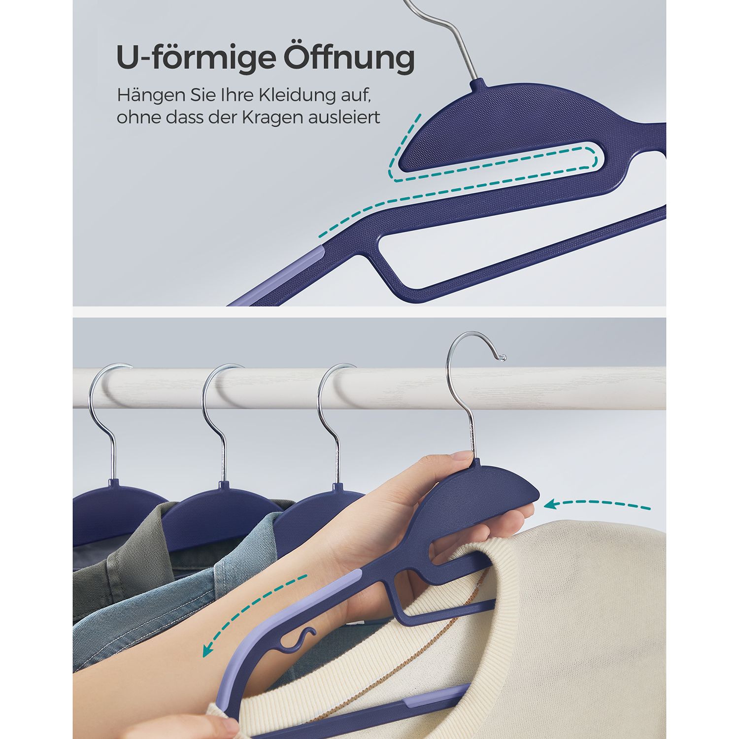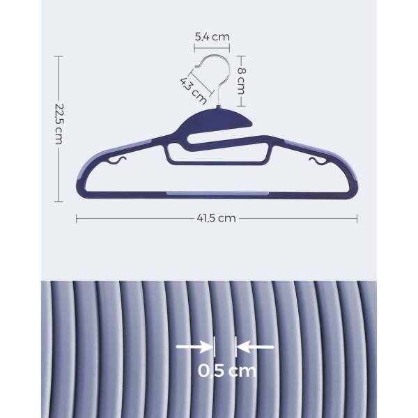 Pakabos yra tamsiai mėlynos ir šviesiai mėlynos spalvos, todėl jos ne tik funkcionalios, bet ir stilingos. Vienos pakabos dydis yra 41,5 x 0,5 x 22,5 cm , o 20 pakabų svoris siekia 1,7 kg.
