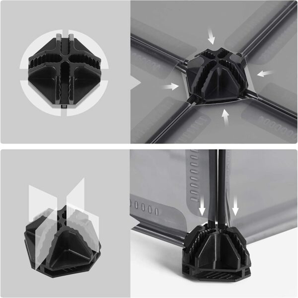 • Surinkdami įsitikinkite, kad plastikinės plokštės visiškai užsifiksuotų į plastikines jungtis, kad būtų padidintas aptvaro stabilumas.