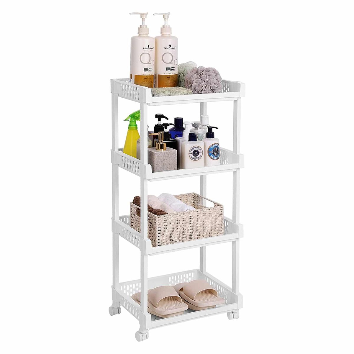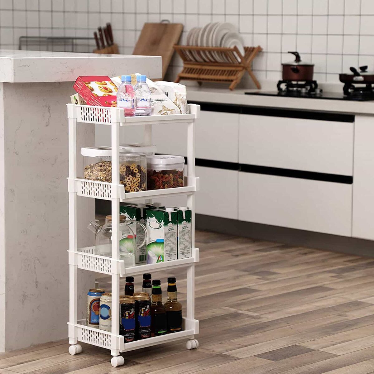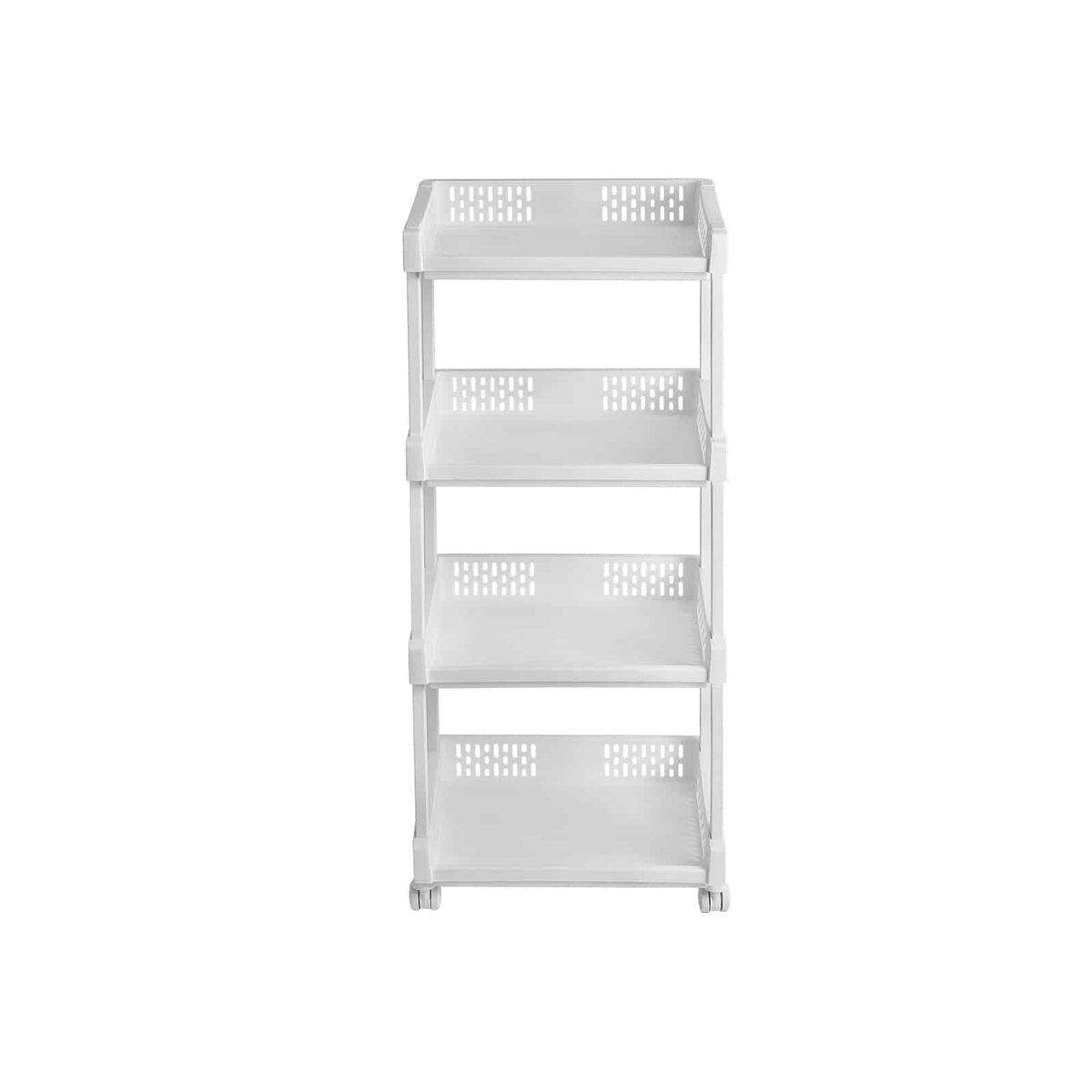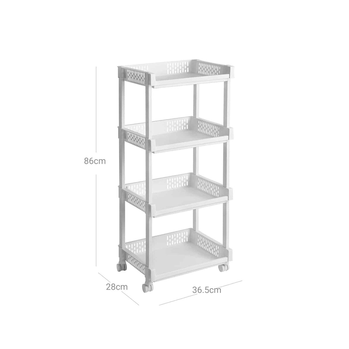 Plastikinis vežimėlis, baltos spalvos, yra puikus sprendimas tiems, kurie ieško daug vietos daiktams laikyti, bet nori išlaikyti kompaktišką dizainą. Šis vežimėlis, kurio matmenys yra 36,5 x 28 x 86 cm, turi 4 gerai paskirstytus daiktų skyrius, kurie puikiai tinka įvairiems virtuvės reikmenims, bakalėjos prekėms, kosmetikai, žaislams ar biuro reikmenims laikyti. Šoninės laikymo skyrių sienelės suteikia lentynai žaismingą dizainą.