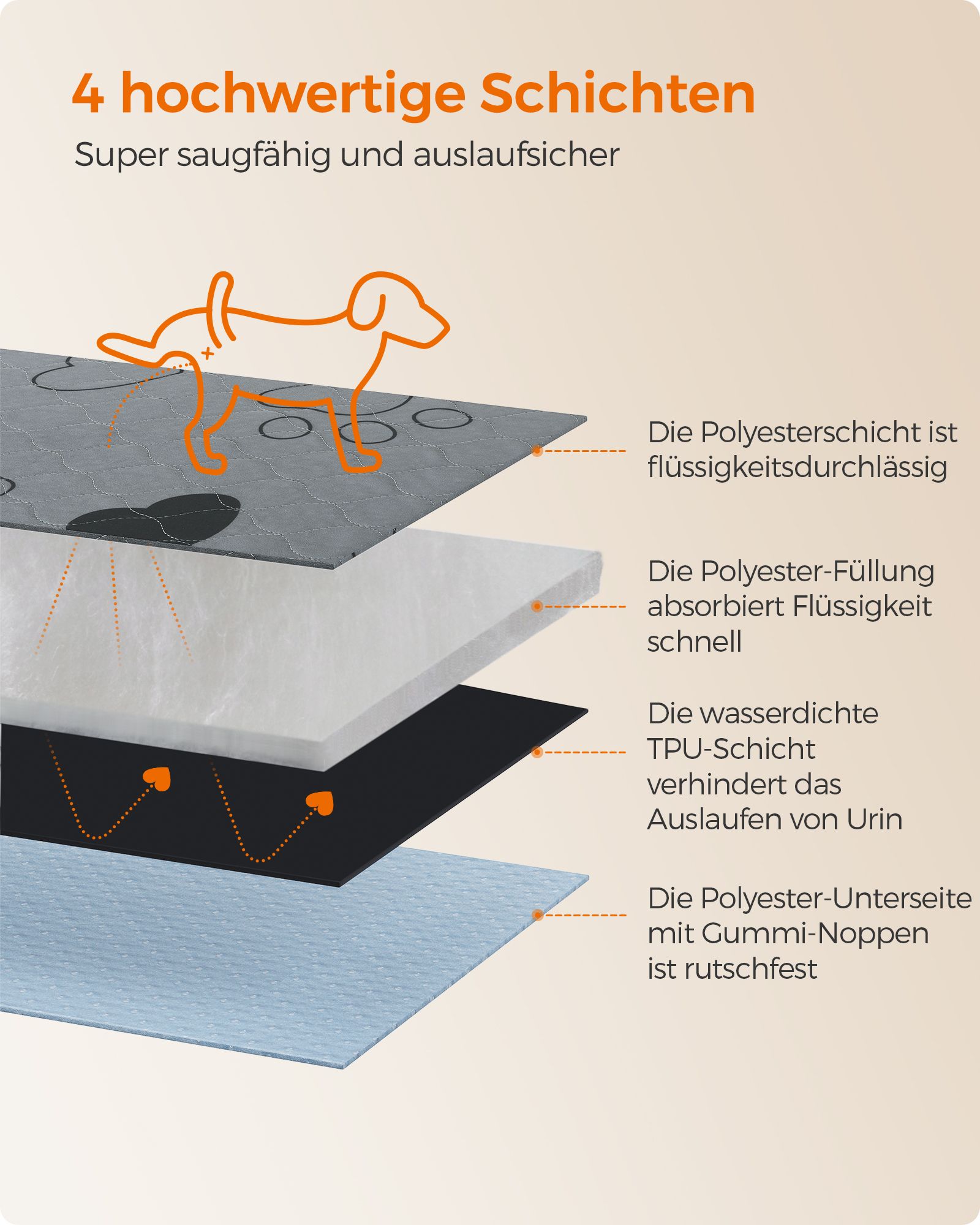• Pirmasis sluoksnis: Poliesterio paviršius – švelnus ir patvarus, užtikrinantis komfortą jūsų augintiniui.