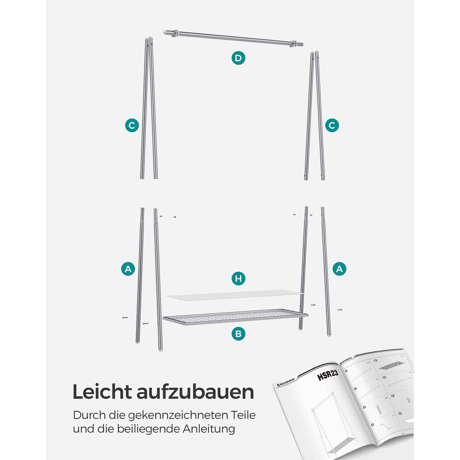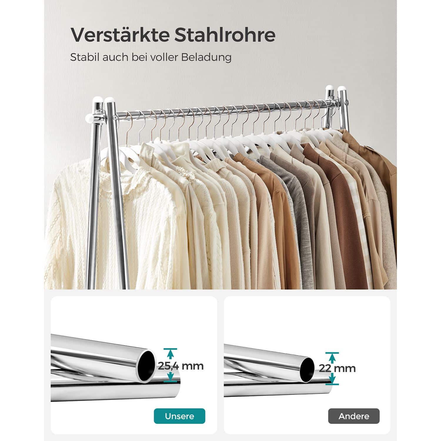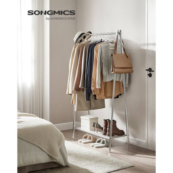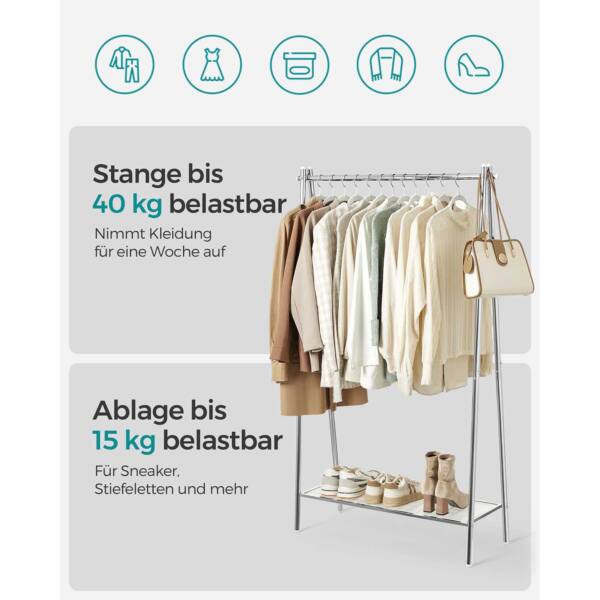 Kabykla sveria tik 3,3 kg, todėl ją lengva perkelti iš vienos vietos į kitą. Maksimali strypo statinė apkrova yra 40 kg, o lentynos – 15 kg, todėl galite saugiai laikyti įvairius drabužius ir aksesuarus.