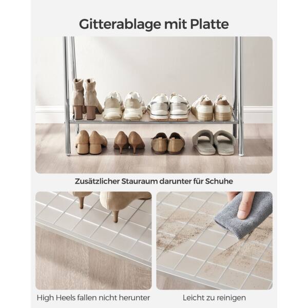 Plieninė drabužių kabykla su lentyna, sidabrinės spalvos, yra puikus sprendimas jūsų drabužių organizavimui. Ši kabykla ne tik funkcionali, bet ir stilinga, todėl puikiai tiks bet kuriame interjere.