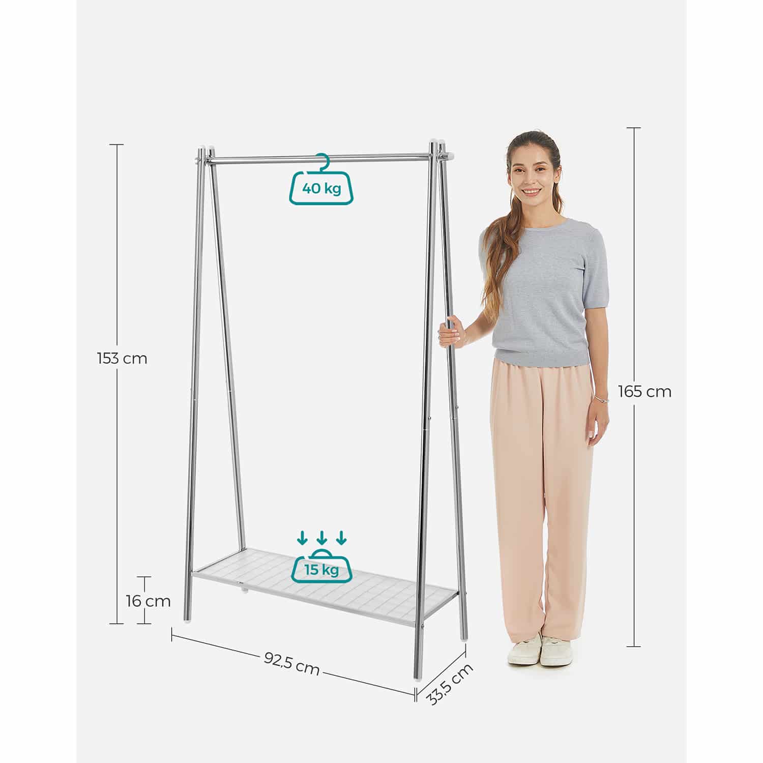 Šios kabyklos matmenys yra 33,5 x 92,5 x 153 cm (plotis x gylis x aukštis), todėl ji neužims daug vietos, tačiau suteiks pakankamai erdvės jūsų drabužiams.