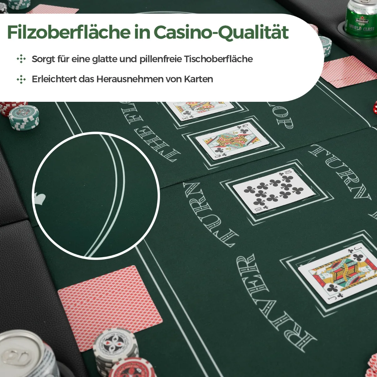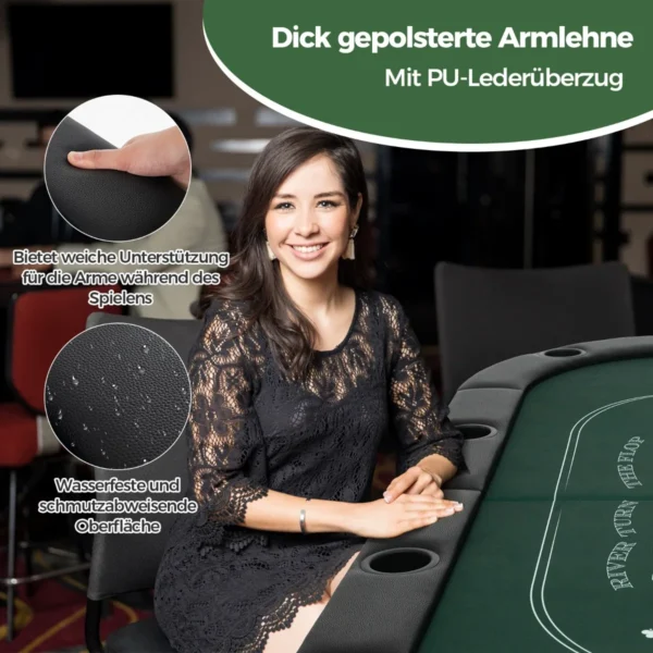 Pokerio stalas 182x82x75 cm juodo ir žalios spalvos puikiai tinka įvairiems kortų žaidimams, tokiems kaip Texas Hold’em ar Blackjack. Sulankstomas dizainas leidžia lengvai laikyti stalą namuose ar kelionėse. Patogūs paminkštinti porankiai ir veltinio paviršius užtikrina komfortą ir gerą žaidimų patirtį.