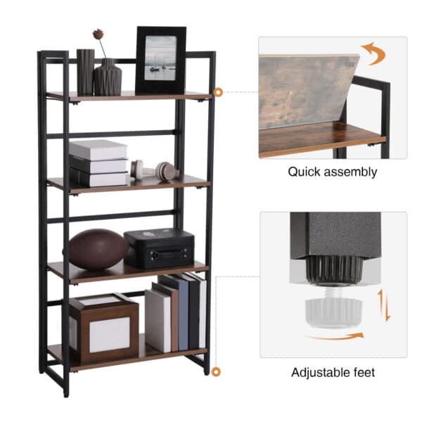 Sumanus dizainas: Dėl sulankstomo rėmo VASAGLE pramoninio dizaino 4 lygių lentyną galima greitai surinkti vos dviem veiksmais. Pervežti ir pastatyti knygų lentyną dar niekada nebuvo taip paprasta, o tai ypač naudinga persikraustant. Papildomi skersiniai baldo galinėje dalyje užtikrina dar didesnį stabilumą ir apsaugo, kad ant lentynos laikomi daiktai nenukristų.