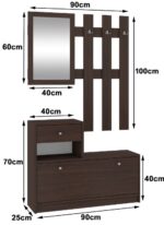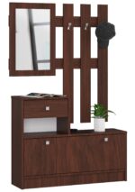 – Rinkinys iš dilimui atsparios laminuotos plokštės – Durų fasadai iš laminuotos plokštės – Šarnyrinės durys – Su stalčiumi, veidrodžiu ir trimis metalinėmis pakabomis – Durų viduje yra tuščia vieta – Matomi kraštai, padengti ABS ratlankiu, padidinantys atsparumą pažeidimams – Satino durų ir stalčių rankenos – Savaiminio surinkimo rinkinys – Pristatymo instrukcija – Gamintojo garantija 24 mėn. Prieškambario baldai su kabykla ir batų spintele yra funkcionalūs ir išsiskiria madingu dizainas. Jie tinka bet kokiam interjerui, tiek moderniam, tiek tradiciniam. Dėl santykinai mažų matmenų venge baldai prieškambariui taip pat tinka siauram ir nepastebimo mažo ploto koridoriui. Į komplektą įeina erdvi batų spintelė papildomai su atvira, maža lentyna ir stalčiumi, kuriame galėsite laikyti raktus, vartelių nuotolinio valdymo pultą ar kitus daiktus, kurie turėtų turėti nuolatinę vietą. Spintelės viršuje galima pasidėti rankinę, portfelį arba kaip patogų suoliuką keičiant batus. Wenge baldų komplektas ne tik atrodo elegantiškai, bet ir yra praktiškas naudojant bei leidžia daug lengviau palaikyti tvarką prieškambaryje, kuris yra kiekvienų namų vitrina. Prieškambario baldai iš laminuotos plokštės yra atsparūs ilgalaikiam naudojimui, trinčiai ir braižymui. Prieškambario baldų komplekte yra papildomai įrengtas efektingas veidrodis, įrėmintas į spalvų derinį rėmelį.