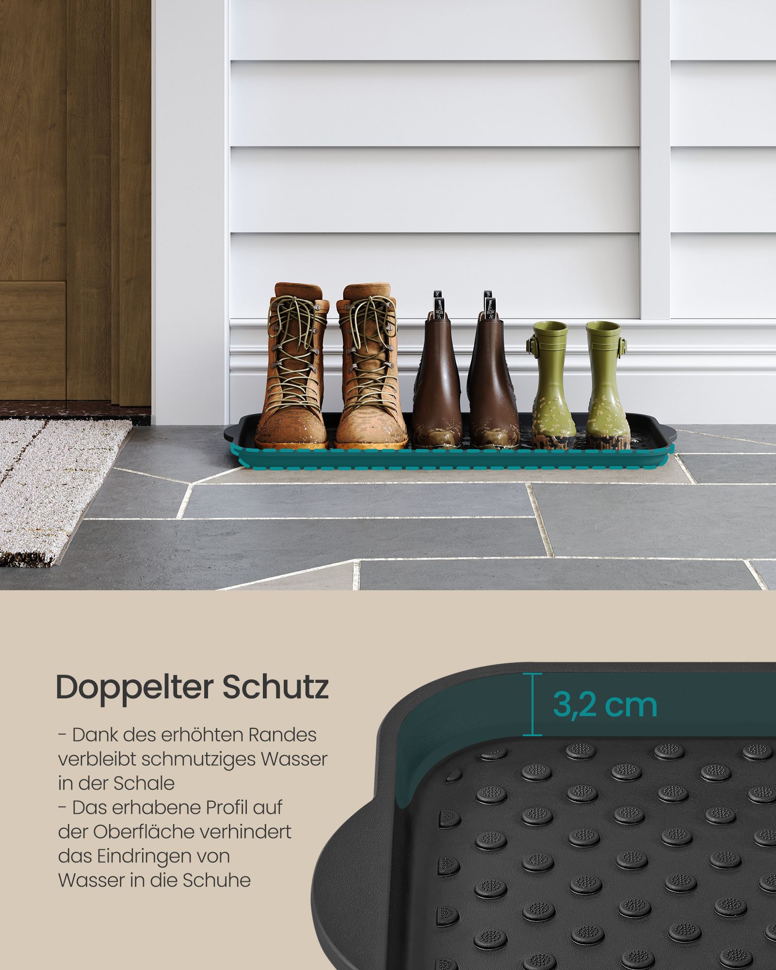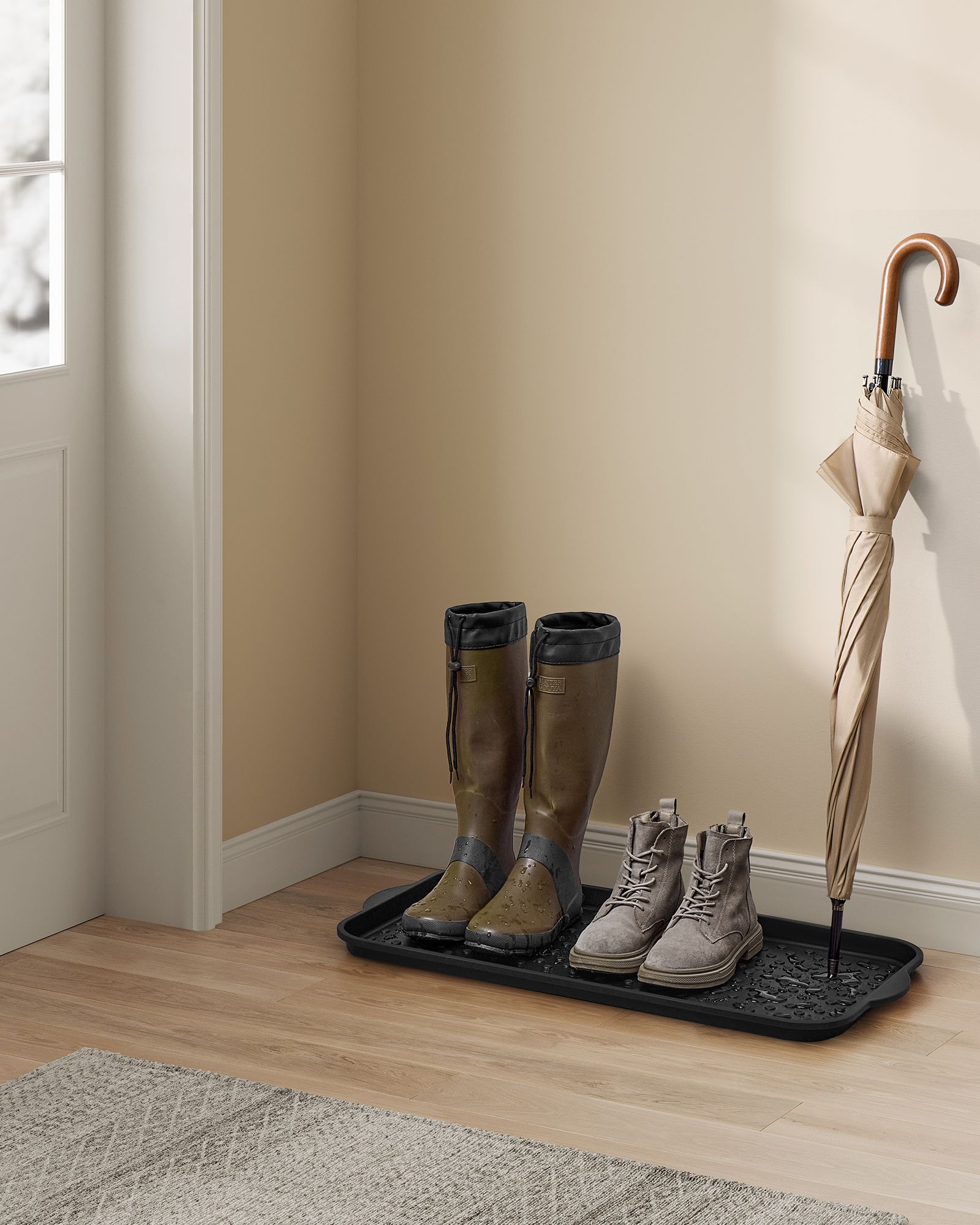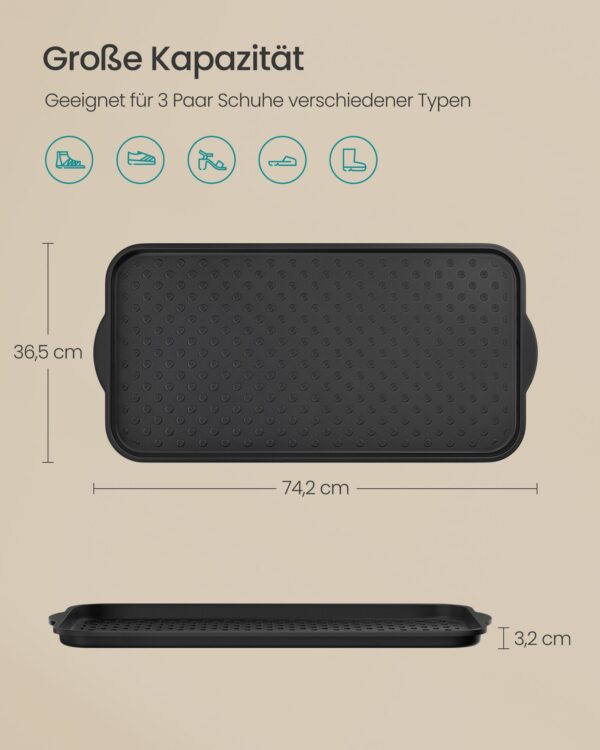 Šis prieškambario batų kilimėlis yra puikus sprendimas jūsų batų laikymui ir organizavimui. Juodos spalvos dizainas suteikia elegancijos ir stiliaus jūsų interjerui.