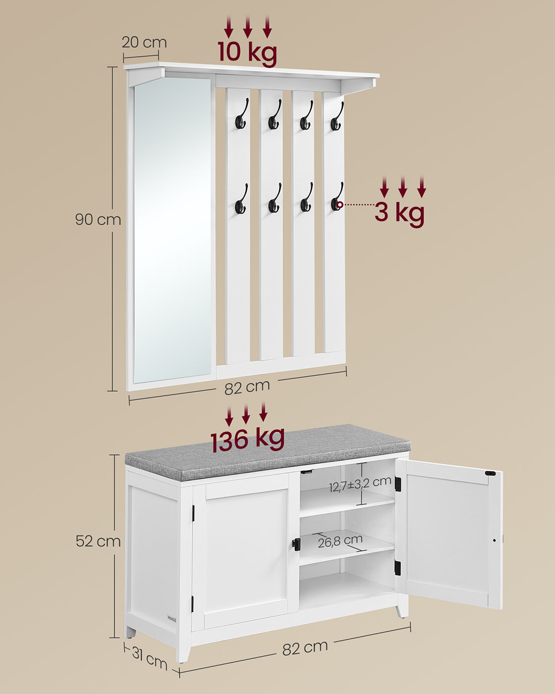 Bendras komplekto svoris siekia 23,8 kg. Maksimali batų suoliuko sėdynės statinė apkrova yra 136 kg, o kiekvienos batų stendo lentynos – 10 kg. Vieno dvigubo kablio apkrova gali siekti iki 3 kg, o maksimali sieninės drabužių kabyklos apkrova – 10 kg, su bendra apkrova iki 40 kg.