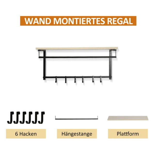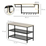 Naudodami praktišką HOMCOM prieškambario rinkinį, visi jūsų paltai, viršutiniai drabužiai, krepšiai, batai ir kiti aksesuarai yra gerai sutvarkyti. Pagaminta iš medžio drožlių plokštės su melamino paviršiumi ir metaliniu rėmu, ši prieškambario tvarkyklė puikiai tinka jūsų prieškambario ir kitų gyvenamųjų patalpų tvarkingumui. Be šešių palto kabliukų, jame yra trijų pakopų batų lentyna, ant kurios galėsite patogiai įsitaisyti ir apsiauti batus. Įsigykite ir daugiau niekada nieko nepraleisite!