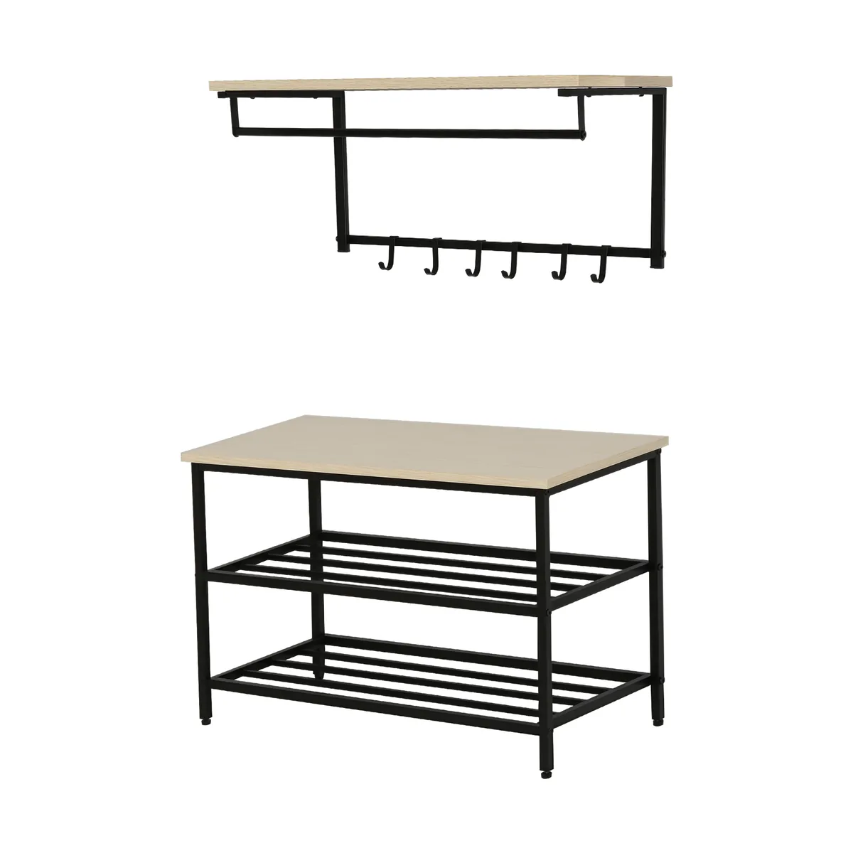 - ✔ Šį prieškambario rinkinį sudaro 2 dalys: prie sienos tvirtinama paltų kabykla ir batų kabykla