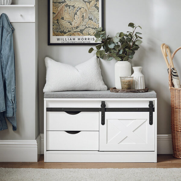 Šis suolas taip pat pasižymi patogiu sėdėjimu, nes yra pagamintas iš aukštos kokybės medvilnės ir lino audinio bei minkštos kempinės. Pakelta bazė apsaugo nuo drėgmės, o tinkamas aukštis užtikrina patogų batų keitimą.