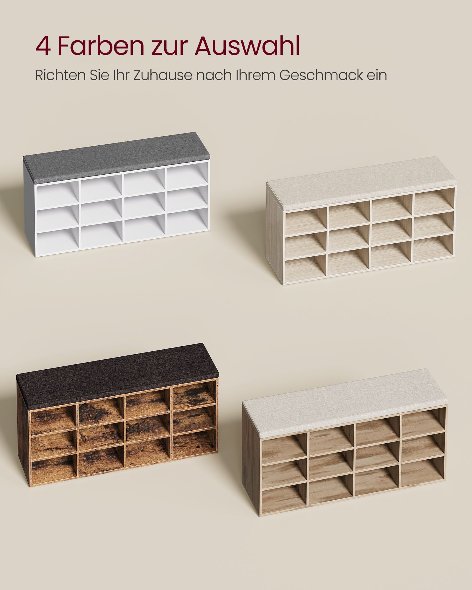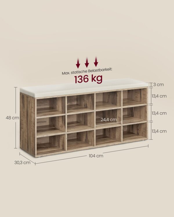 Pagamintas iš aukštos kokybės medžio drožlių plokštės, putplasčio ir lino imitacijos, šis suoliukas yra tvirtas ir patogus. Jo matmenys yra 30,3 x 104 x 48 cm (D x P x A), o svoris siekia 18,3 kg.