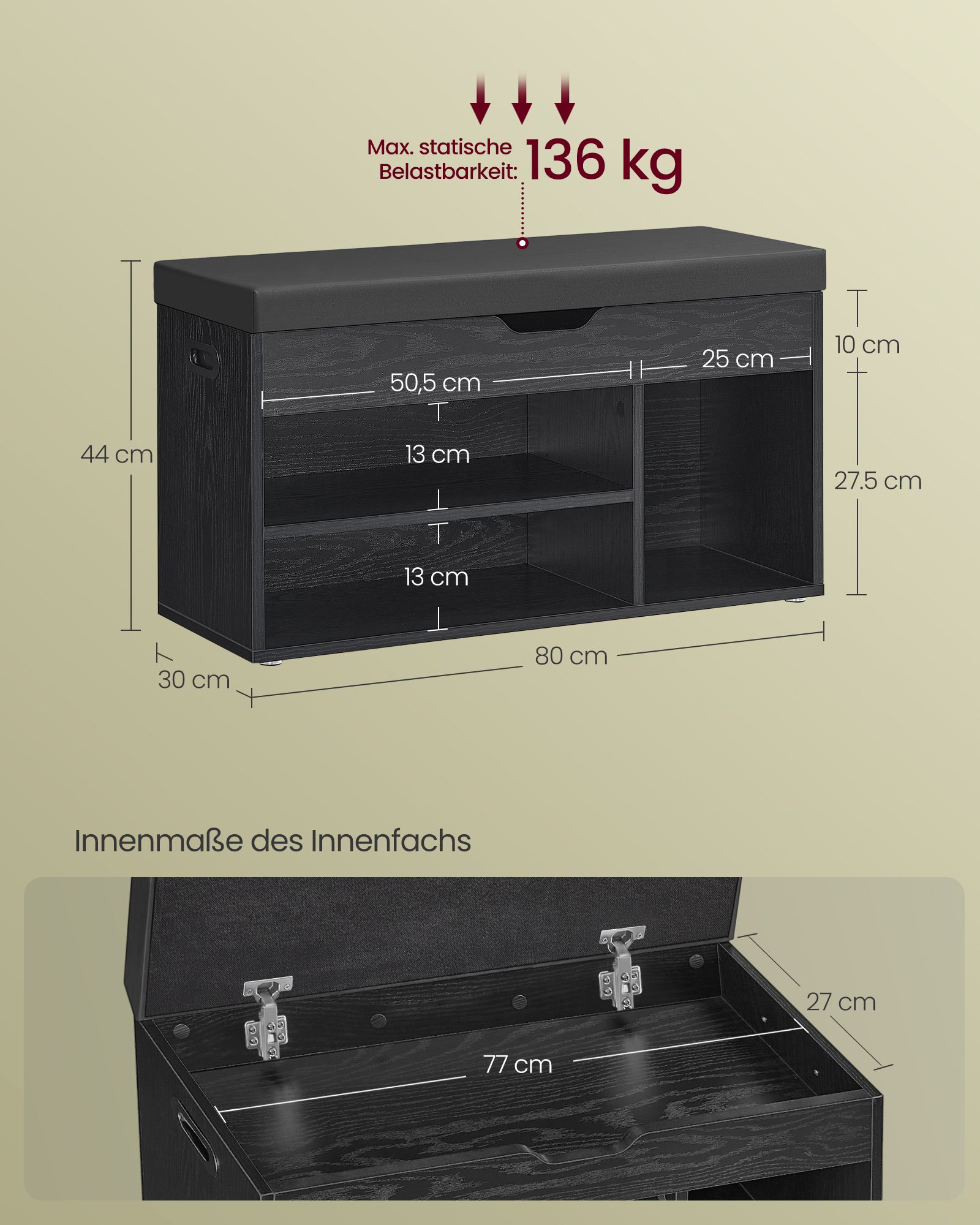Pagamintas iš aukštos kokybės medžio drožlių plokštės, putplasčio ir poliuretano (PU), šis suoliukas yra tvirtas ir patvarus. Jo matmenys yra 30 x 80 x 44 cm (D x P x A), o svoris siekia 14,6 kg.