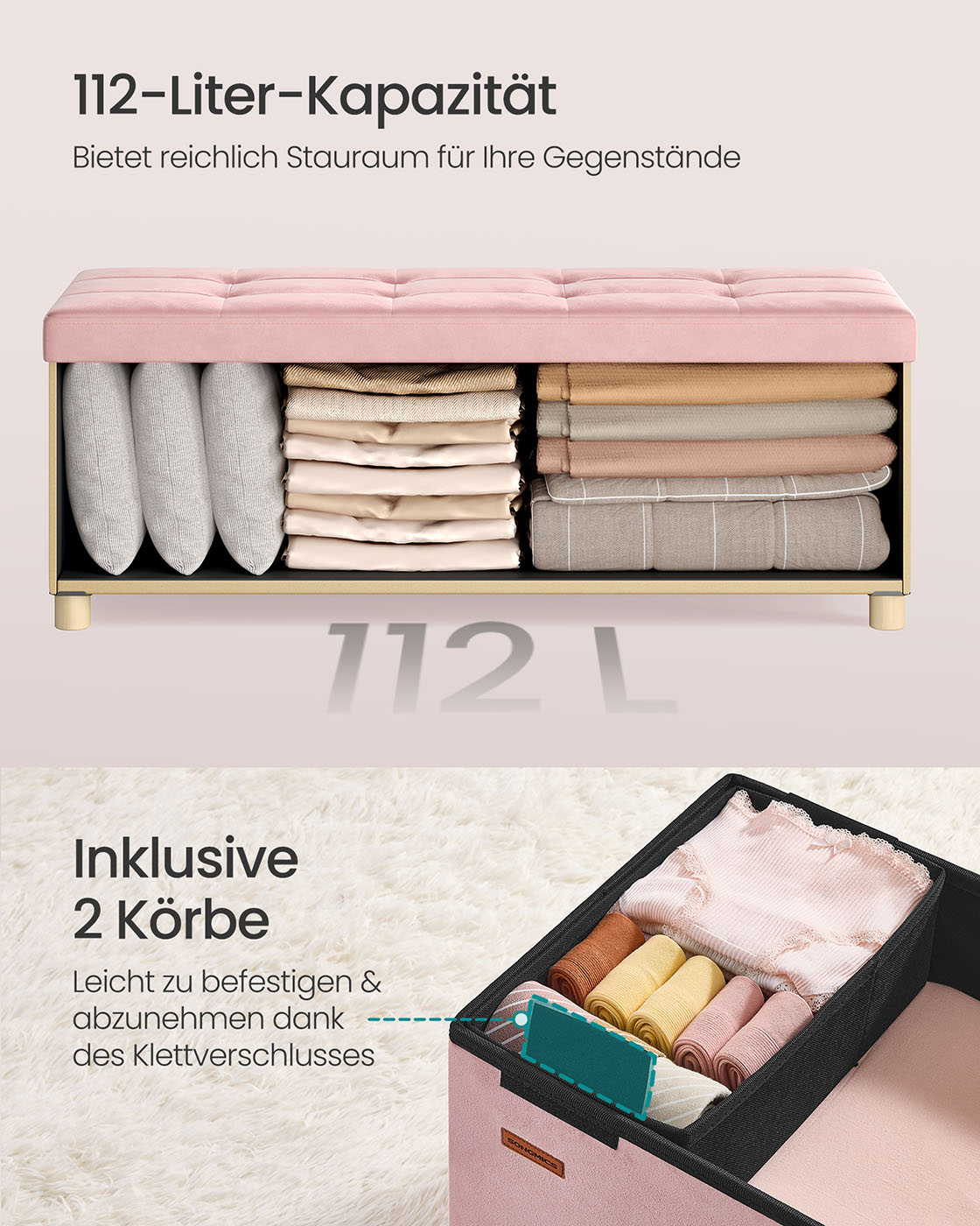 Maksimali statinė apkrova yra 300 kg, todėl jis yra itin patikimas. Be to, suoliukas turi 112 litrų talpą, kuri leidžia patogiai laikyti įvairius daiktus.