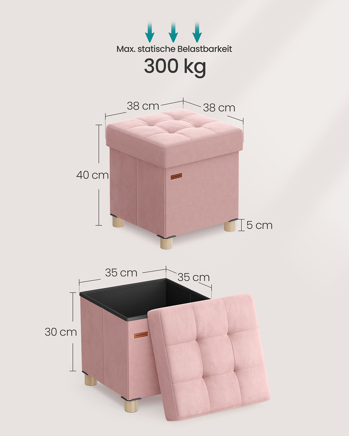Pagamintas iš aukštos kokybės aksomo, MDF (vidutinio tankio medienos plaušų plokštės), putplasčio ir neaustinio audinio, šis suoliukas yra tvirtas ir ilgaamžis. Jo dydis yra 38 x 38 x 40 cm, o svoris siekia 3,8 kg.