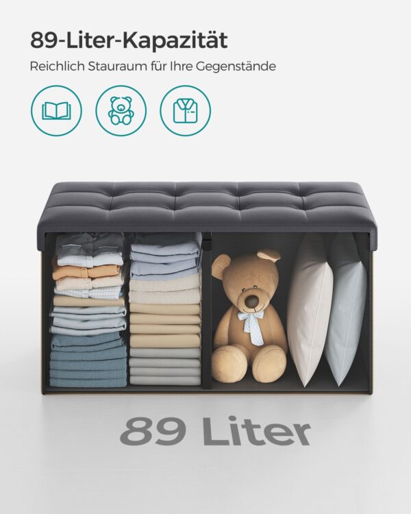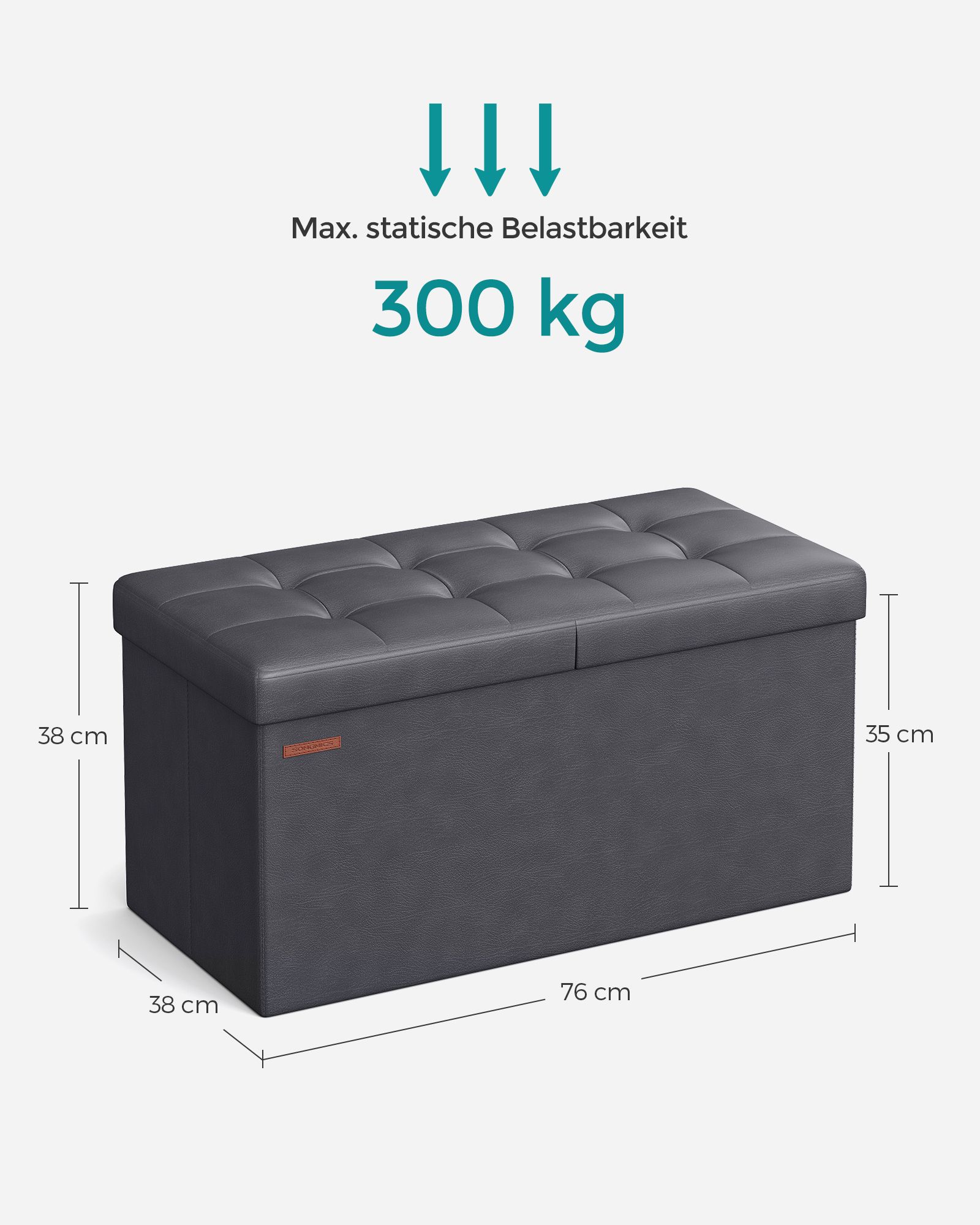 Pagamintas iš aukštos kokybės MDF (vidutinio tankio medienos plaušų plokštės), PU ir putplasčio, šis suoliukas yra tvirtas ir patvarus. Išoriniai matmenys yra 38 x 76 x 38 cm, o vidiniai – 34 x 71 x 34 cm.