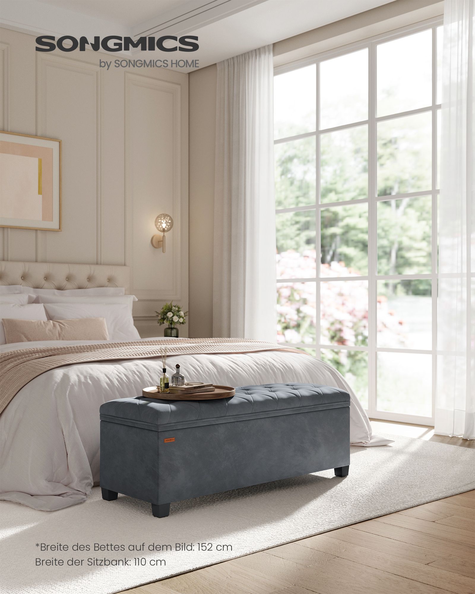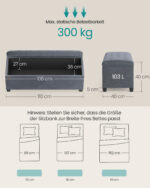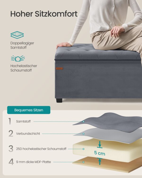 Pagamintas iš aukštos kokybės MDF (vidutinio tankio medienos plaušų plokštės), aksomo ir 25D didelio elastingumo putų, šis suoliukas yra tvirtas ir patogus. Jo svoris siekia 11,1 kg, o maksimali statinė apkrova yra 300 kg.