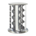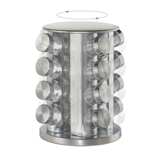 Įneškite tvarkos ir elegancijos į savo virtuvę su šiuo išskirtiniu prieskonių stovu. Pagamintas iš aukštos kokybės nerūdijančio plieno, šis besisukantis prieskonių stovas ne tik puikiai atrodo, bet ir yra itin funkcionalus. Jo modernus dizainas ir sidabrinė spalva puikiai derės prie bet kokio interjero.