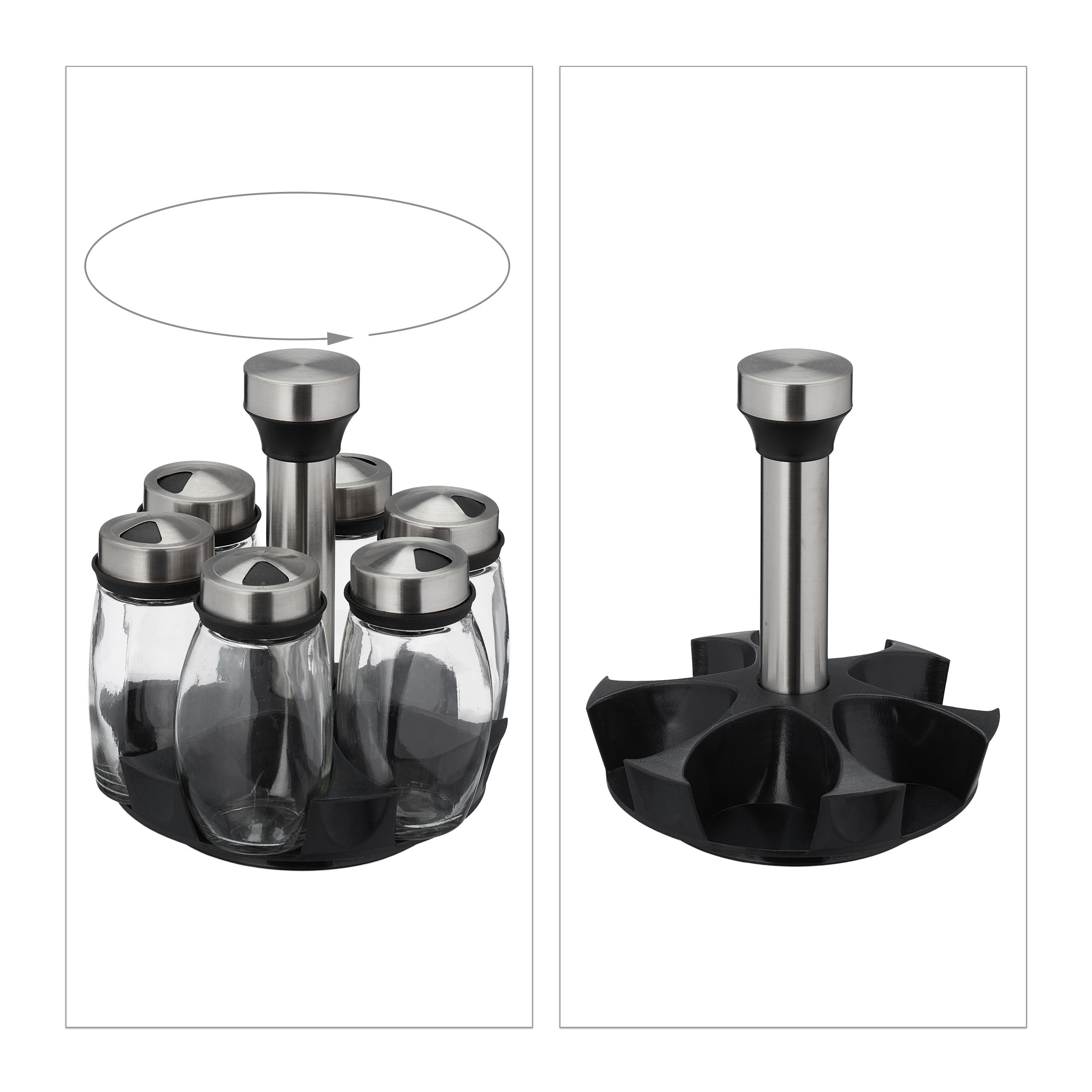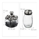 - Funkcionalumas: 6 skaidrios stiklinės talpyklos leidžia patogiai laikyti svarbiausius prieskonius. Reguliuojami sklaidos įdėklai suteikia galimybę naudoti talpyklas kaip prieskonių plaktuvus.