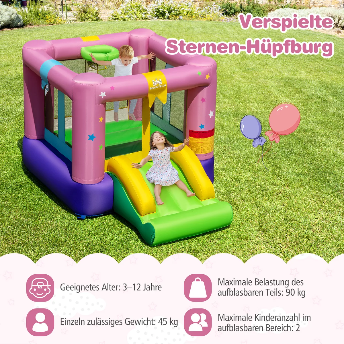 Pripučiamas batutas 240x174x143cm skirta vaikams nuo 3 iki 12 metų aktyviam laisvalaikiui tiek lauke, tiek patalpose. Batutas suteikia erdvę šokinėjimui, žaidimams ir smagioms pramogoms su papildoma čiuožykla bei lankais. Jis pagamintas iš patvarių medžiagų, užtikrinančių ilgaamžiškumą ir saugumą.