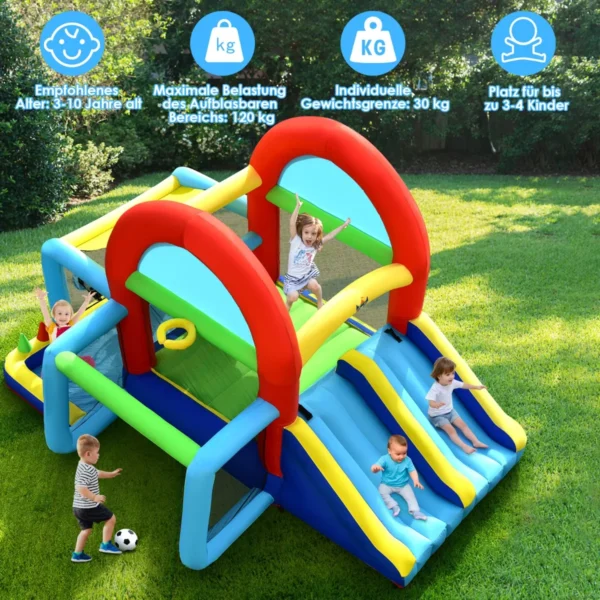 Pripučiamas batutas 424x300x240cm, įvairių spalvų – puikus lauko žaidimų centras vaikams. Šiame batute sujungtos šokinėjimo, čiuožimo ir sporto veiklos, kurios padeda skatinti aktyvų laisvalaikį ir fizinį aktyvumą. Batutas skirtas 3-4 vaikams iki 120 kg vienu metu.