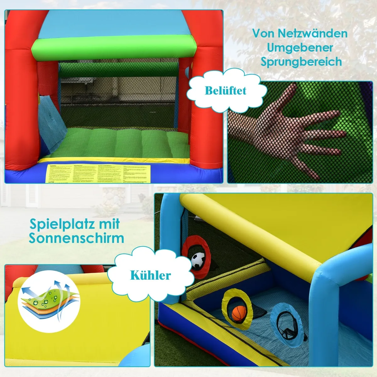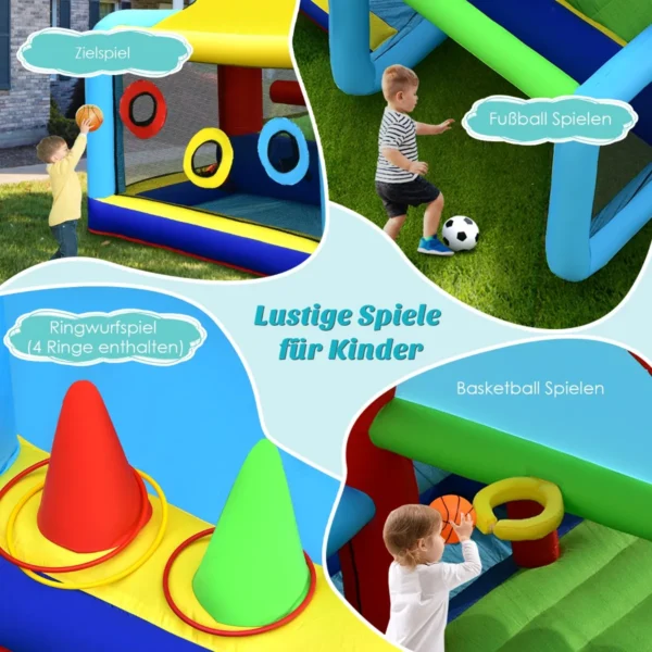 - Pripučiamas batutas apima šokinėjimo zoną, dvi čiuožyklas, futbolo vartus, krepšinio lanką, laipiojimo sienelę, kamuoliukų duobę, taikinio žaidimą ir žiedo mėtymą.