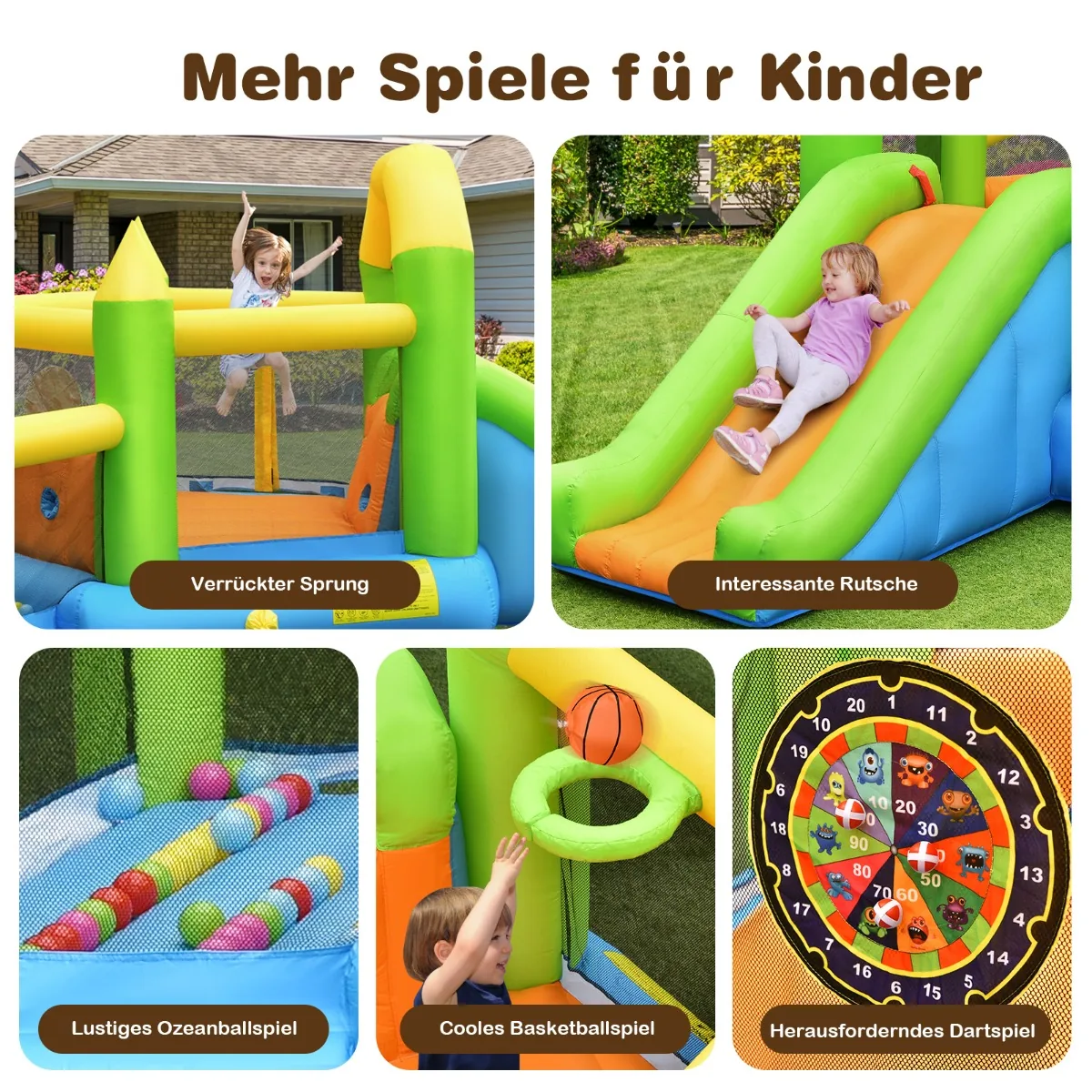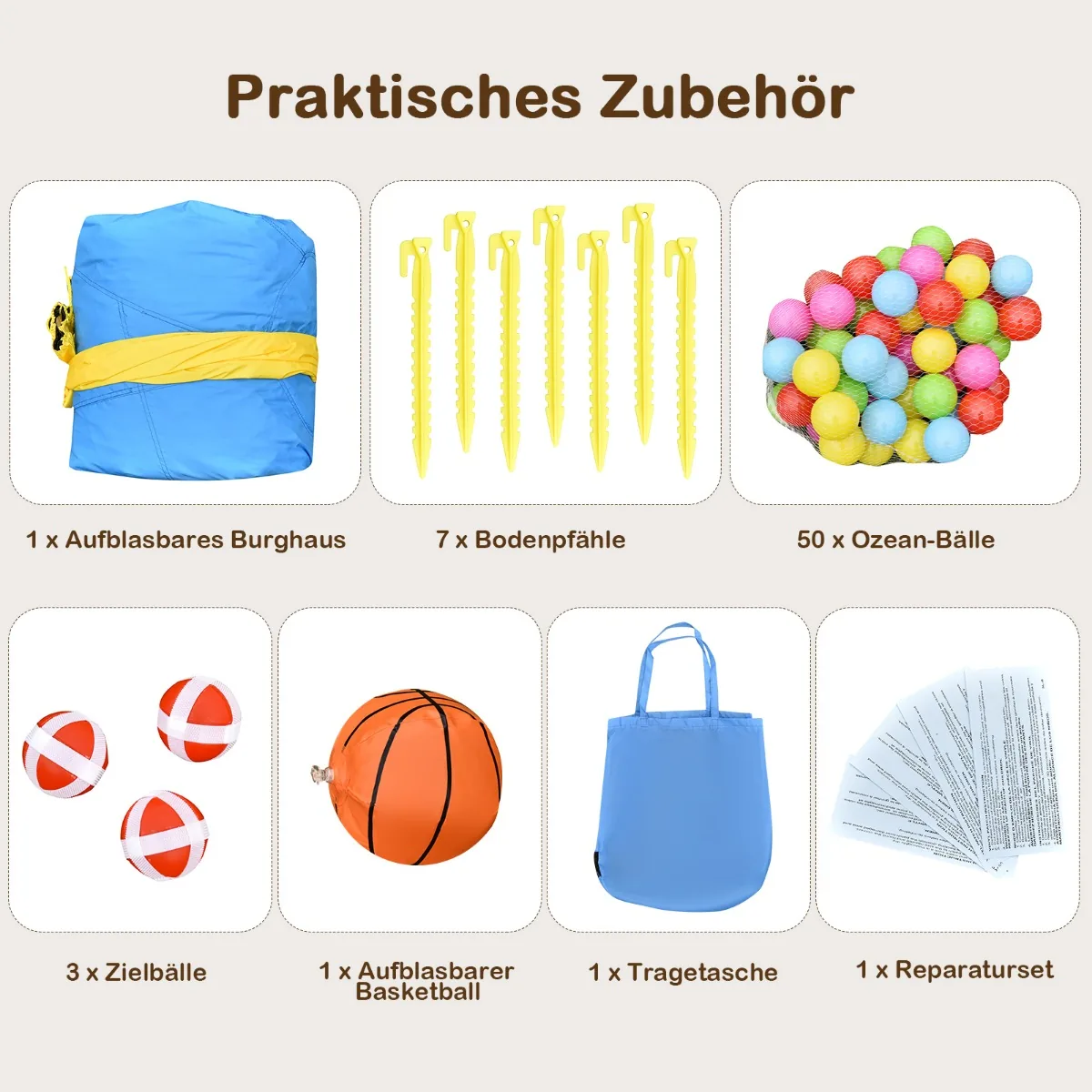 • Daugiau pramogų su 50 spalvingų žaidimo kamuolių, pritvirtintais taikiniais bei pripučiamu krepšinio kamuoliuku.