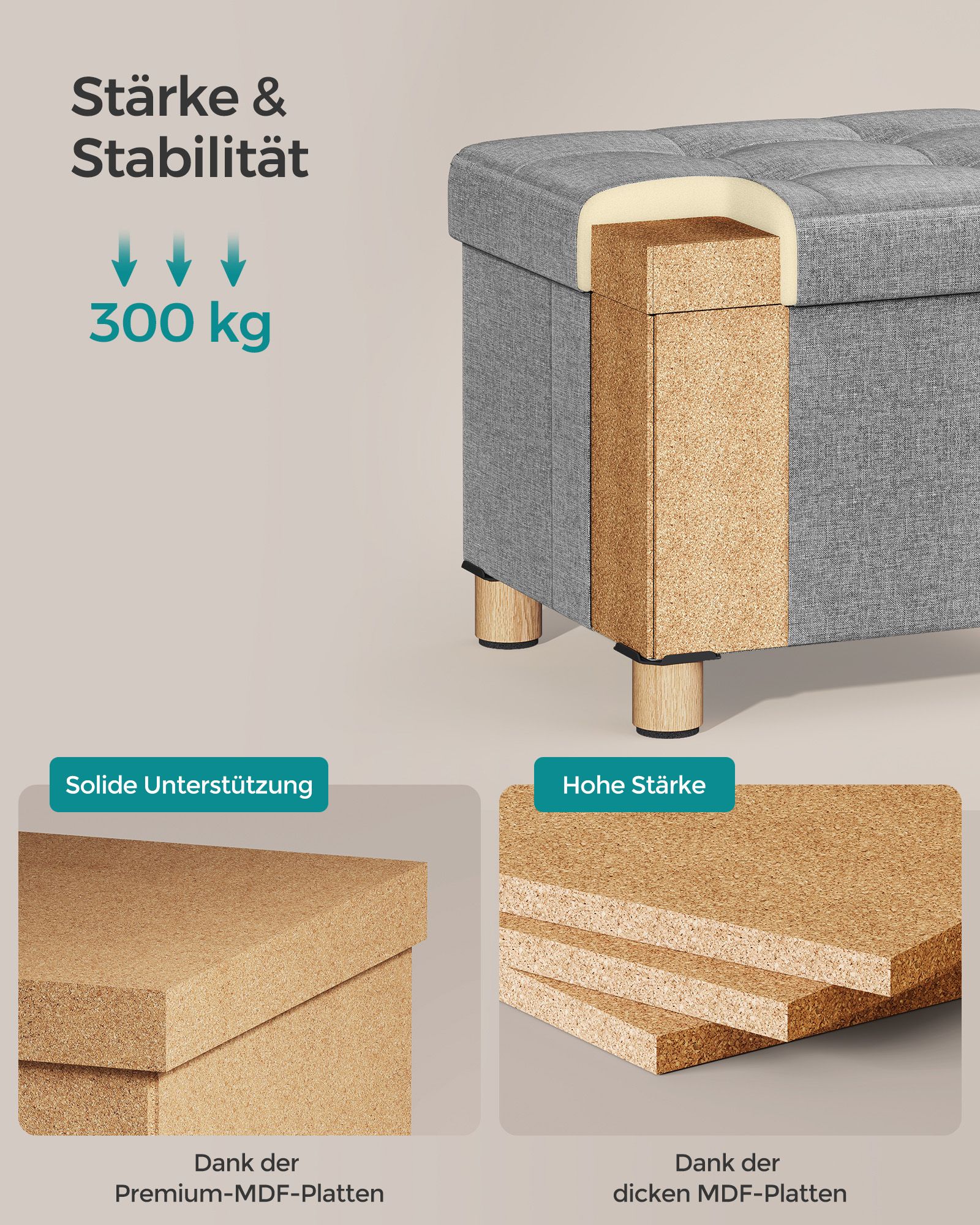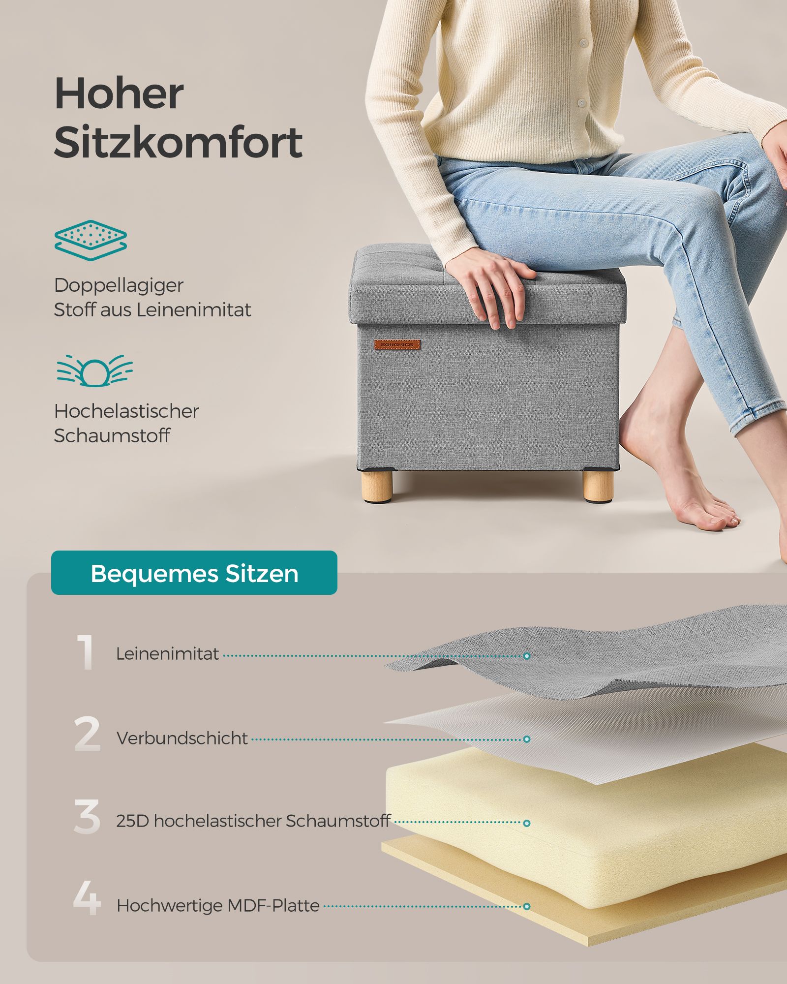 Pagamintas iš aukštos kokybės medžiagų, šis pufas užtikrina ilgaamžiškumą ir patogumą. MDF konstrukcija suteikia tvirtumą, o lino imitacijos apdaila ir didelio elastingumo putos užtikrina komfortą sėdint.