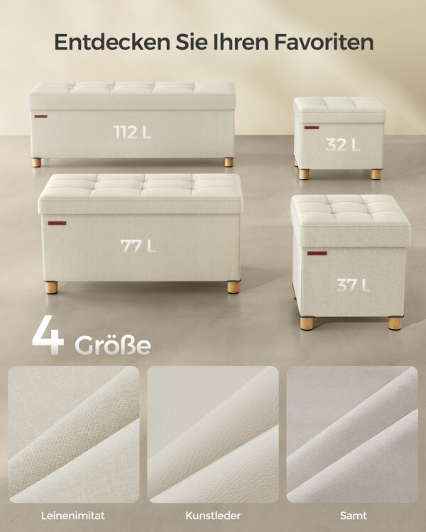 Šis pufas ne tik suteikia papildomą sėdimą vietą, bet ir yra praktiškas sprendimas daiktų laikymui. Jo talpa leidžia patogiai laikyti įvairius daiktus, tokius kaip pagalvės, antklodės ar žaislai, taip padedant palaikyti tvarką jūsų namuose.