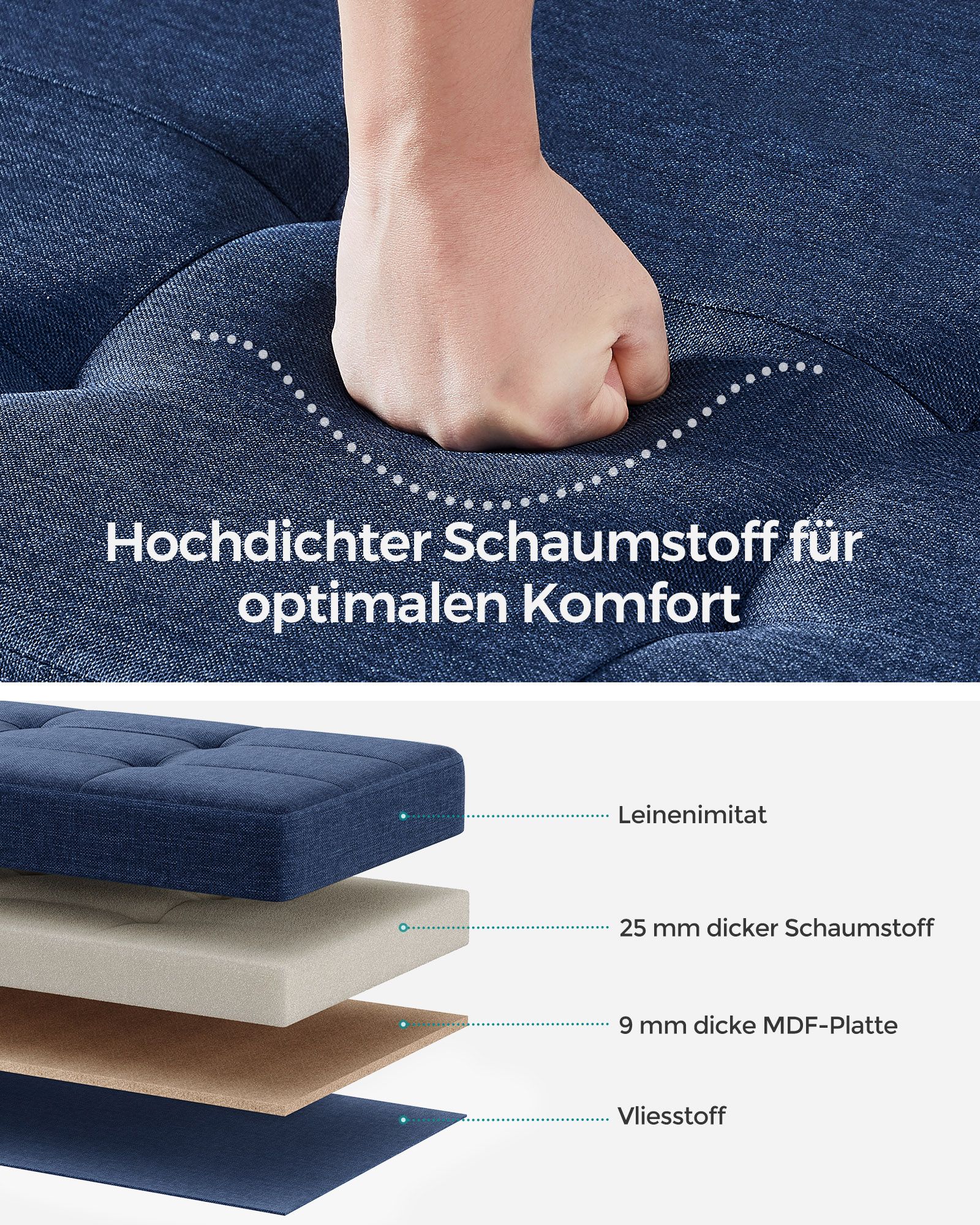 Medžiaga: Lino imitacija, putplastis, MDF (vidutinio tankio medienos plaušų plokštė)