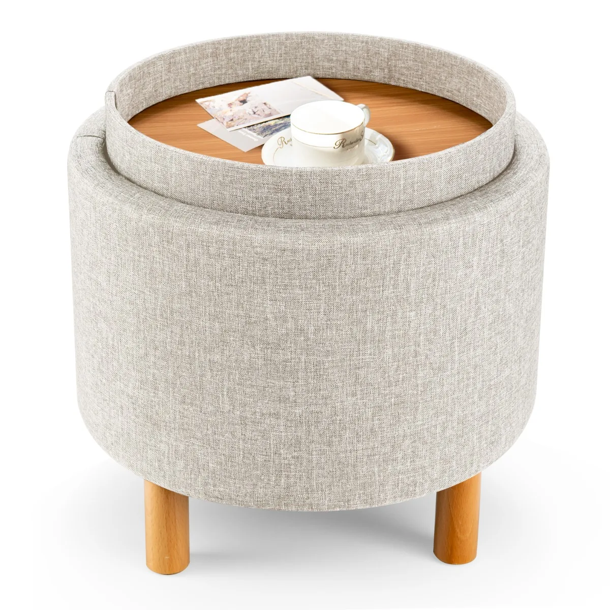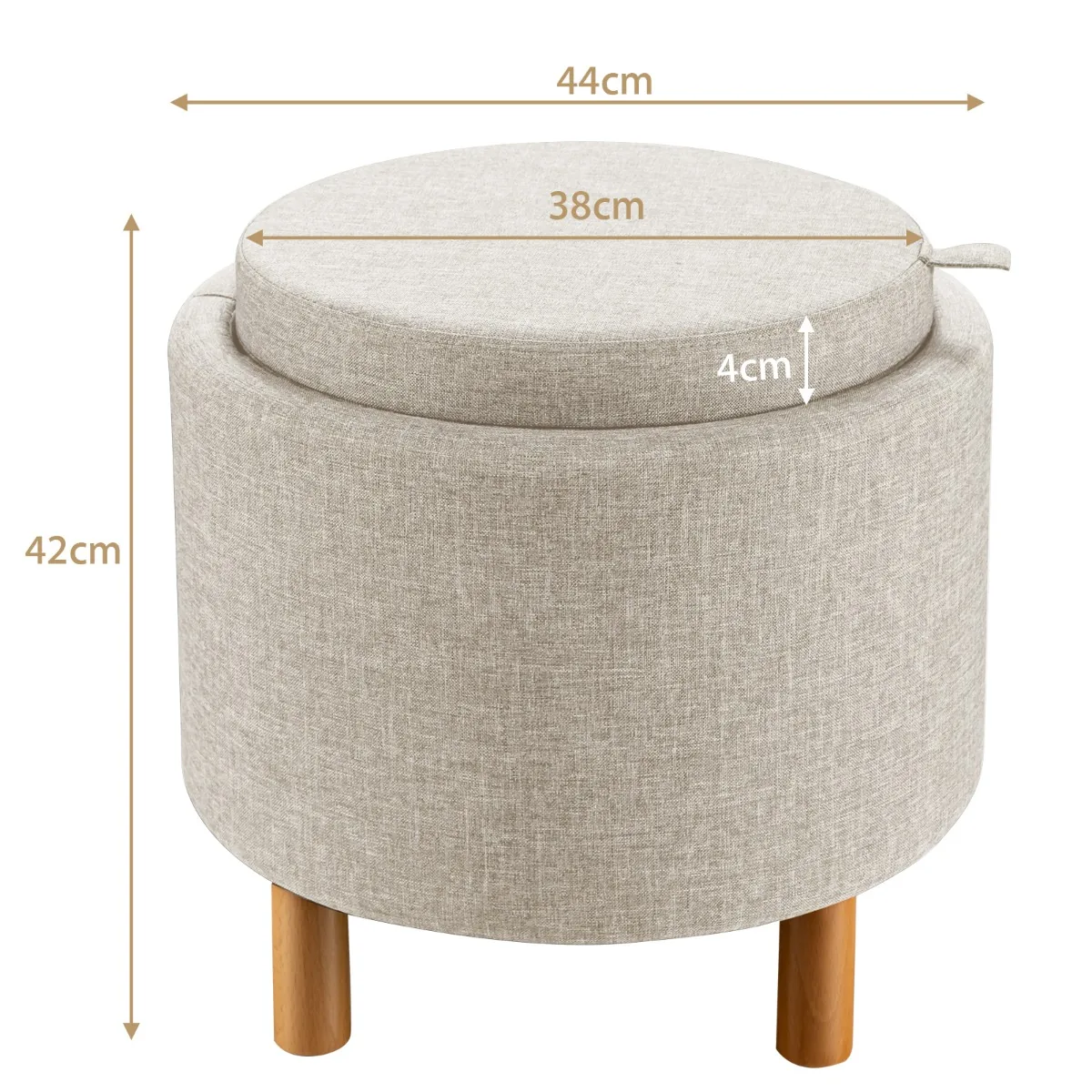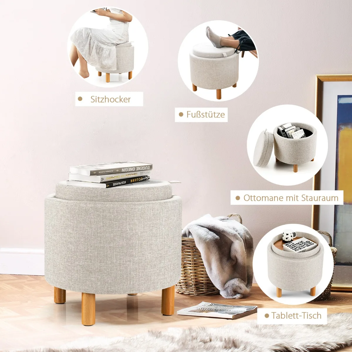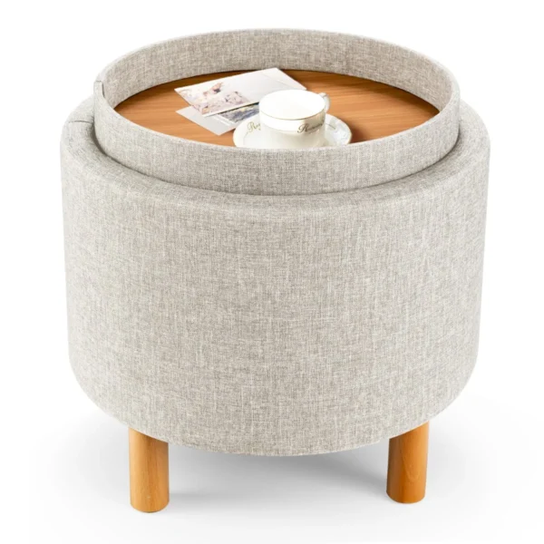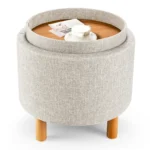 - Apvalus pufas su nuimamu dangčiu sujungia paminkštintą sėdynę ir medinį padėklą.