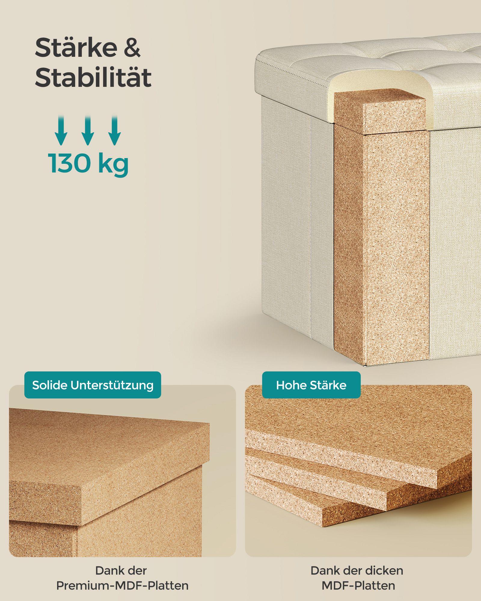 - Medžiaga: Pagamintas iš aukštos kokybės MDF (vidutinio tankio medienos plaušų plokštės), aptrauktas lino imitacija, užtikrinančia ilgaamžiškumą ir patogumą.
