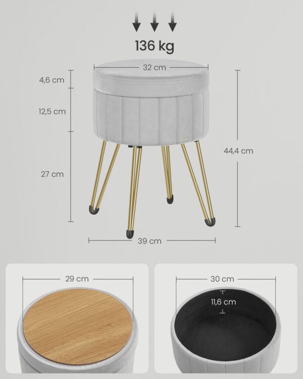 Šis elegantiškas ir funkcionalus pufas yra puikus pasirinkimas tiems, kurie vertina stilių ir praktiškumą. Jo subtili balandžio pilka spalva kartu su auksiniais akcentais suteikia prabangos pojūtį, o aukštos kokybės medžiagos užtikrina ilgaamžiškumą ir komfortą.