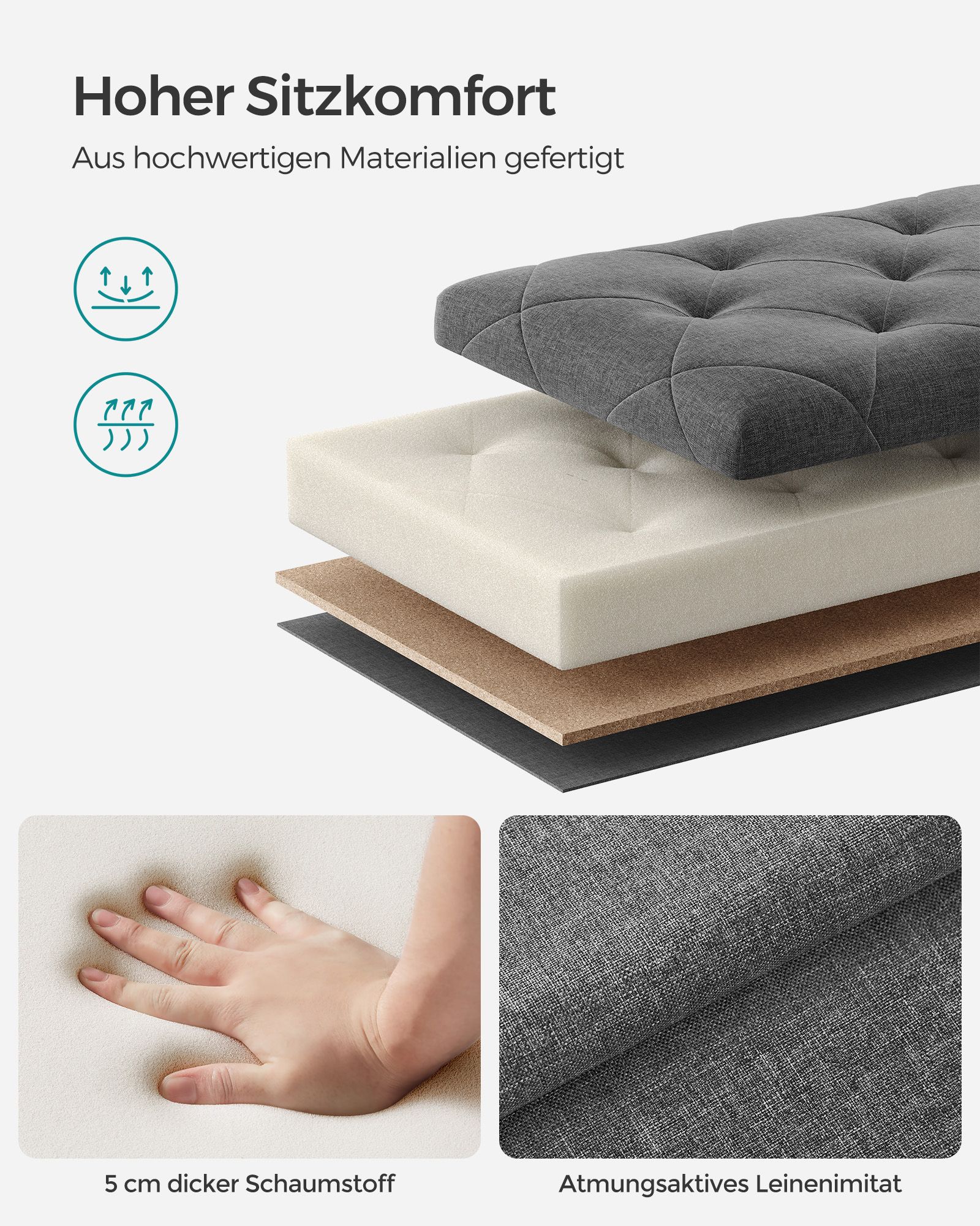 - Medžiaga: MDF (vidutinio tankio medienos plaušų plokštė), lino imitacija, 25D didelio elastingumo putos