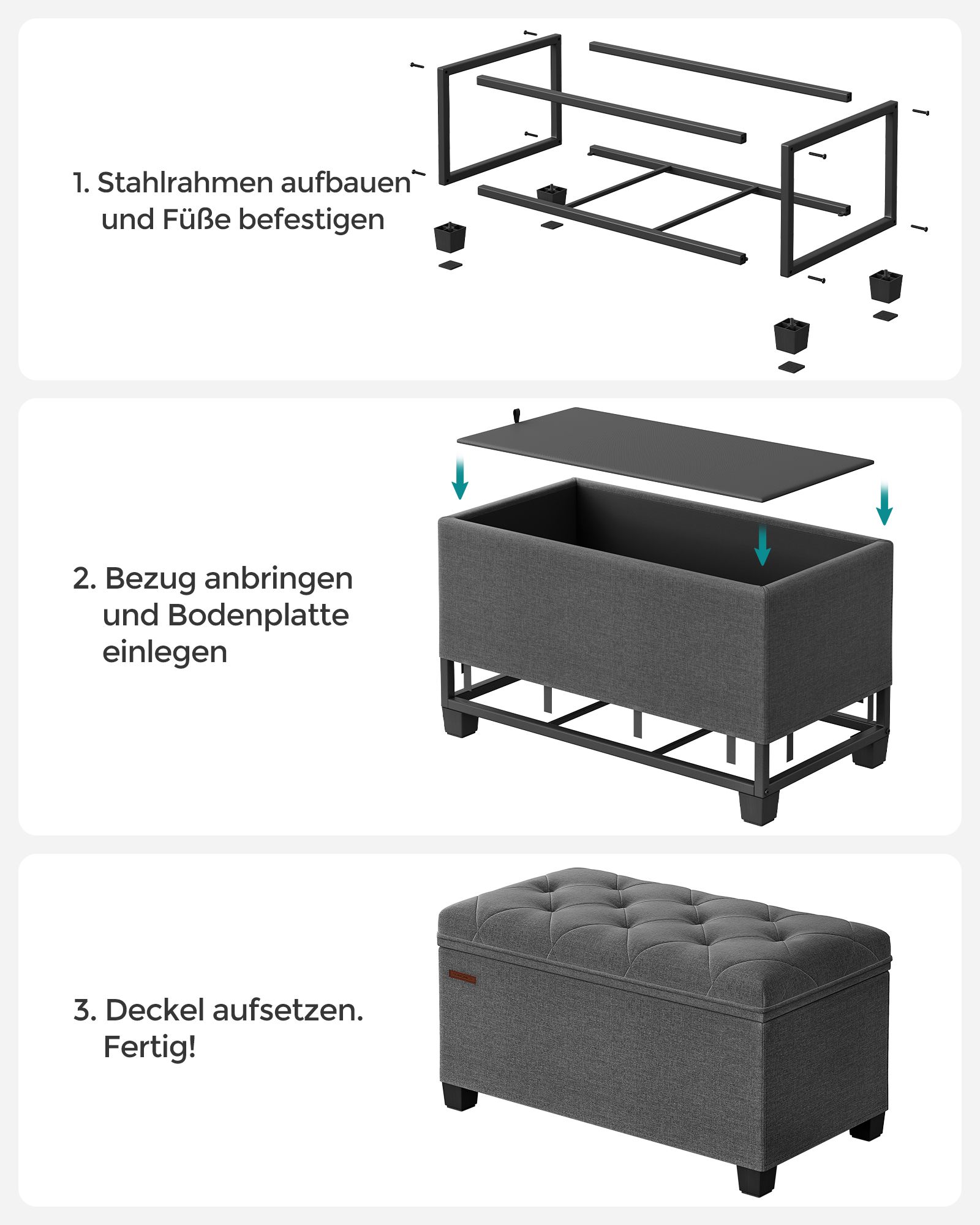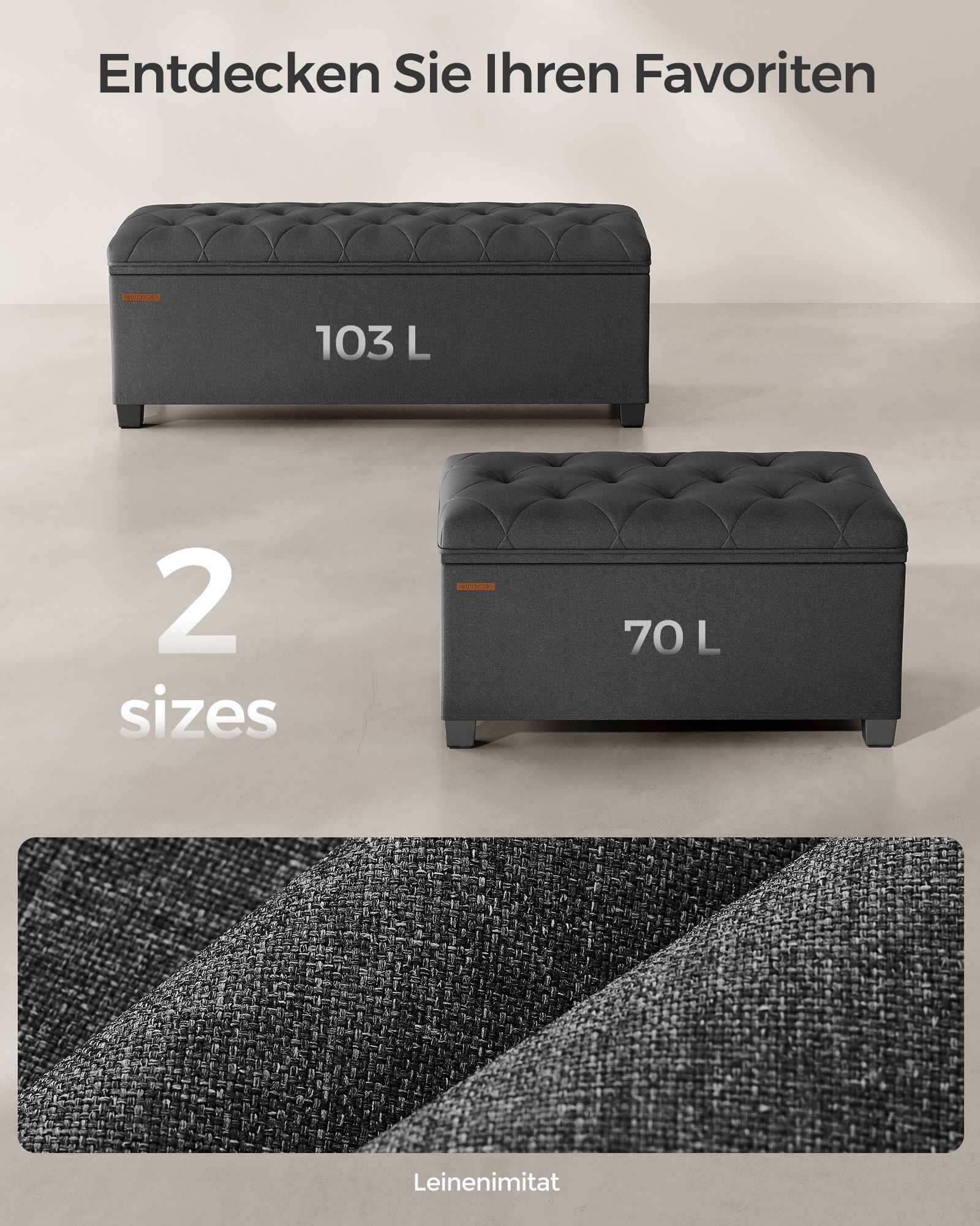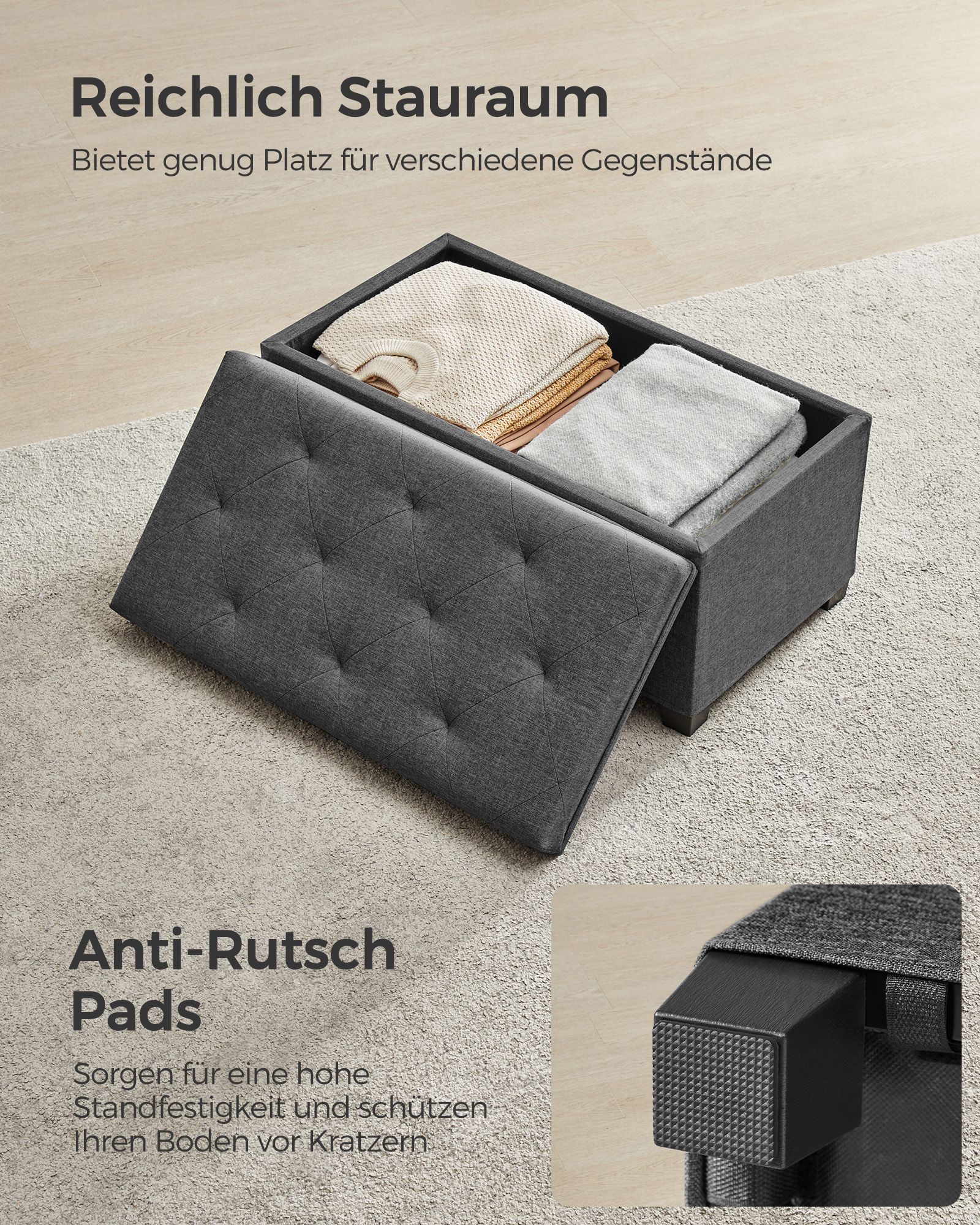 Šis pufas yra ne tik estetiškai patrauklus, bet ir itin funkcionalus. Jo viduje esanti 70 litrų talpa leis Jums patogiai laikyti įvairius daiktus, tokius kaip žurnalai, žaislai ar pledai. Tuo tarpu tvirta konstrukcija užtikrina, kad pufas atlaikys net iki 300 kg svorį, todėl jis puikiai tiks tiek sėdėjimui, tiek daiktų laikymui.