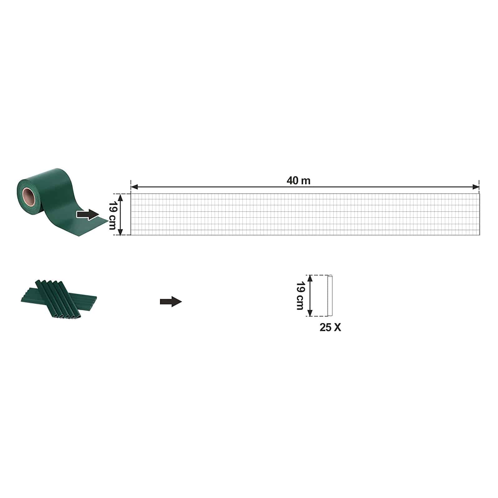 - PVC privatumo juostelė yra įpinta į tinklinę tvorą. Prieš pirkdami, išmatuokite savo tvoros akių dydį, kad nustatytumėte, ar šis gaminys tinka jūsų poreikiams.