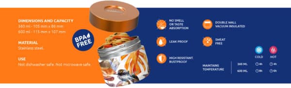 Lengvas ir patogus nerūdijančio plieno termoso dizainas yra pakankamai tvirtas, kad jį būtų galima pasiimti bet kur, nesijaudinant, kad skonis ar kvapas persikels į maistą.Atsparus korozijai, lengvai valomas, puikiai palaiko patiekalo temperatūrą. Visa tai išlaikant modernų ir įmantrų dizainą!Praktiškas, patogus terminis pietų termosas, nepamainomas darbe, kelionėse ar paplūdimyje.Produkto savybės:- Pagamintas iš nerūdijančio plieno – Išlaiko temperatūrą 4 valandas karštiems patiekalams ir 4 valandas šaltiems patiekalams- Dvigubų sienelių vakuuminė izoliacija- Hermetiškas užsukamas dangtelis- Dvi sienelė neleidžia prasiskverbti kvapui, skoniui ir kondensatui – Išorinis apvalkalas visada išlieka kambario temperatūroje- Didelis atsparumas rūdims- Lengvai valomas po tekančiu vandeniu (netinka plauti indaplovėje ar mikrobangų krosnelėje)- 100 % be BPA, nekenksmingas aplinkai- Talpa: 360 ml- Matmenys: 105 mm x 86 mm