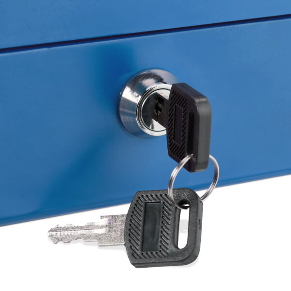 Ši rakinama kasos dėžutė yra ne tik funkcionali, bet ir stilinga, todėl ji taps puikiu pagalbininku jūsų kasdienėje veikloje. Pasirinkite saugumą ir patogumą su mūsų mėlynos spalvos kasos dėžute!
