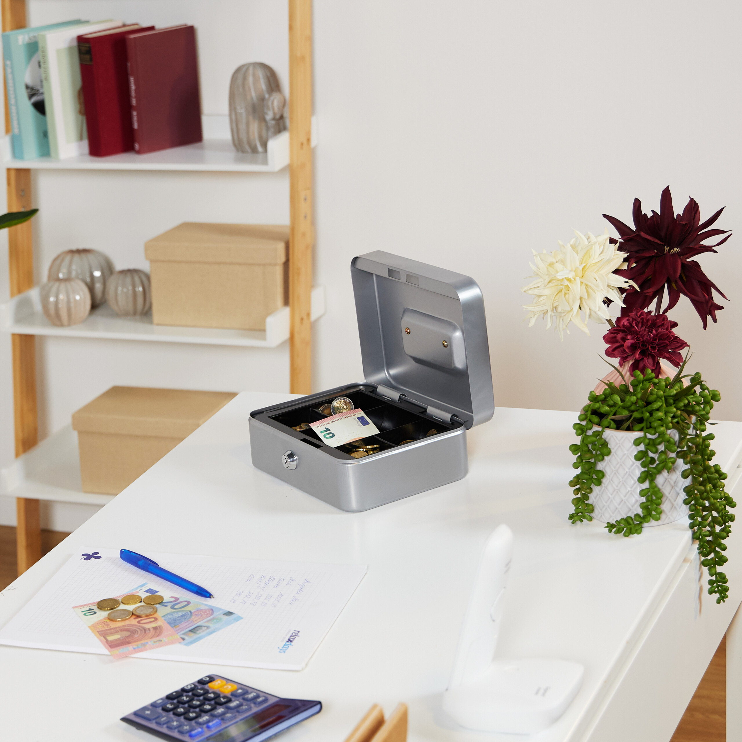 Ieškote patikimo sprendimo grynųjų pinigų saugojimui? Mūsų rakinama kasos dėžutė, elegantiškos sidabrinės spalvos, yra puikus pasirinkimas tiek namų naudojimui, tiek įvairiems renginiams, tokiems kaip sendaikčių turgūs ar mugės.