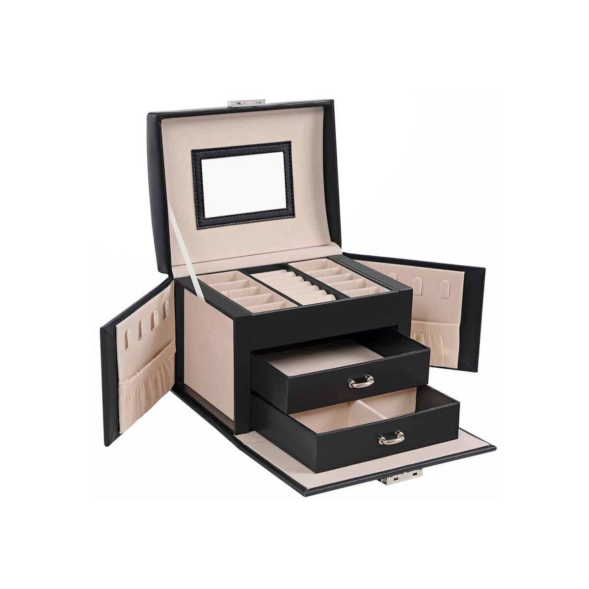 Ši papuošalų dėžutė puikiai tinka tiek kasdieniam naudojimui, tiek ilgesnėms kelionėms. Daugybė saugojimo vietų leidžia pasiimti su savimi svarbiausius lobius – tiesiog nuspręskite, kokius auskarus ir karolius norite nešioti, atsižvelgdami į situaciją!