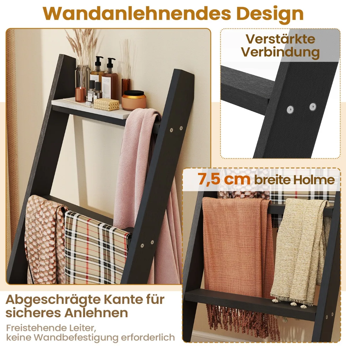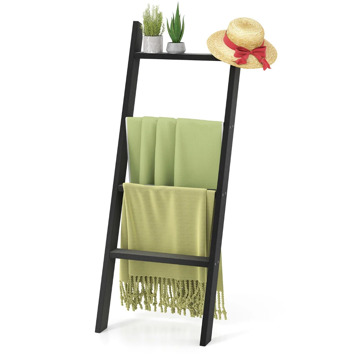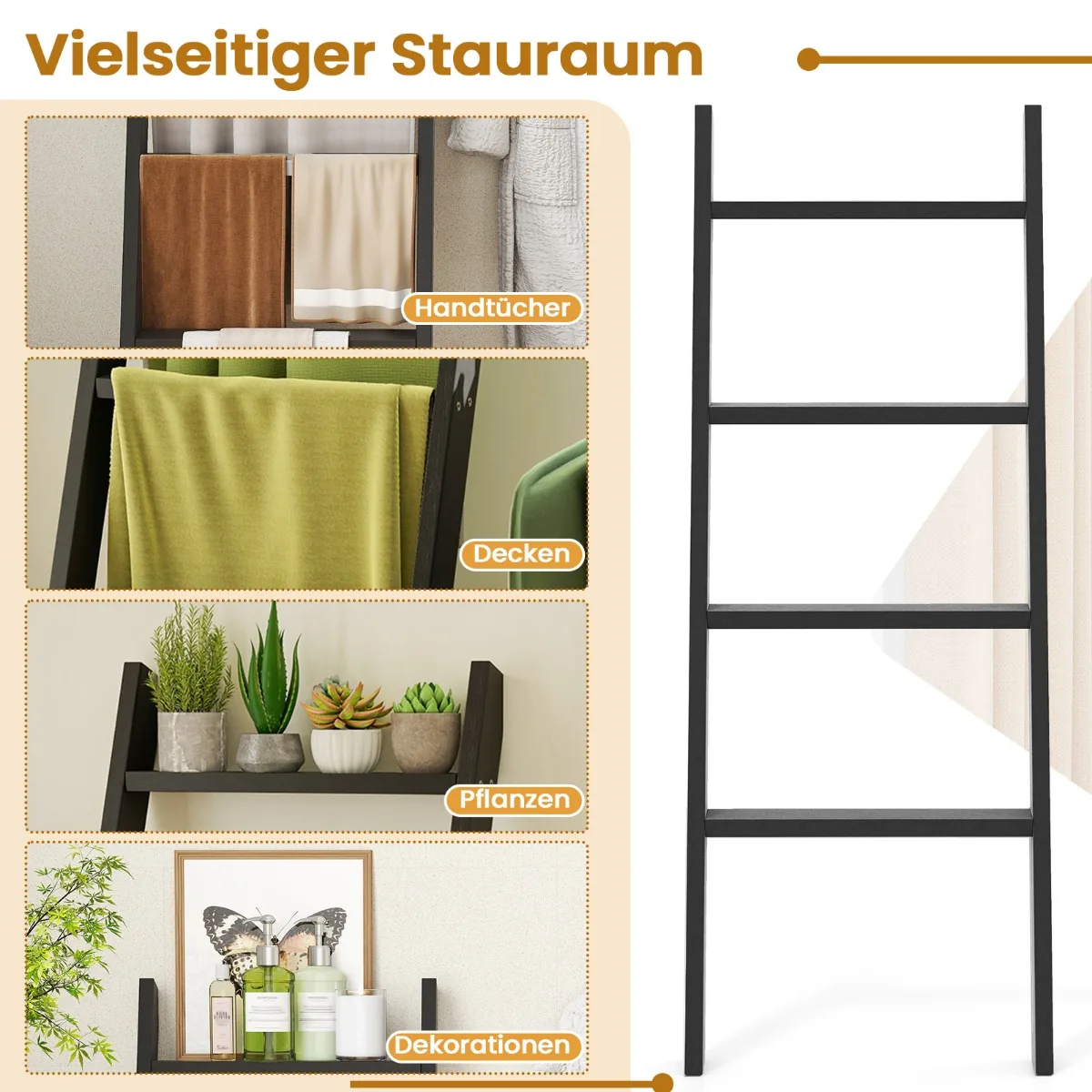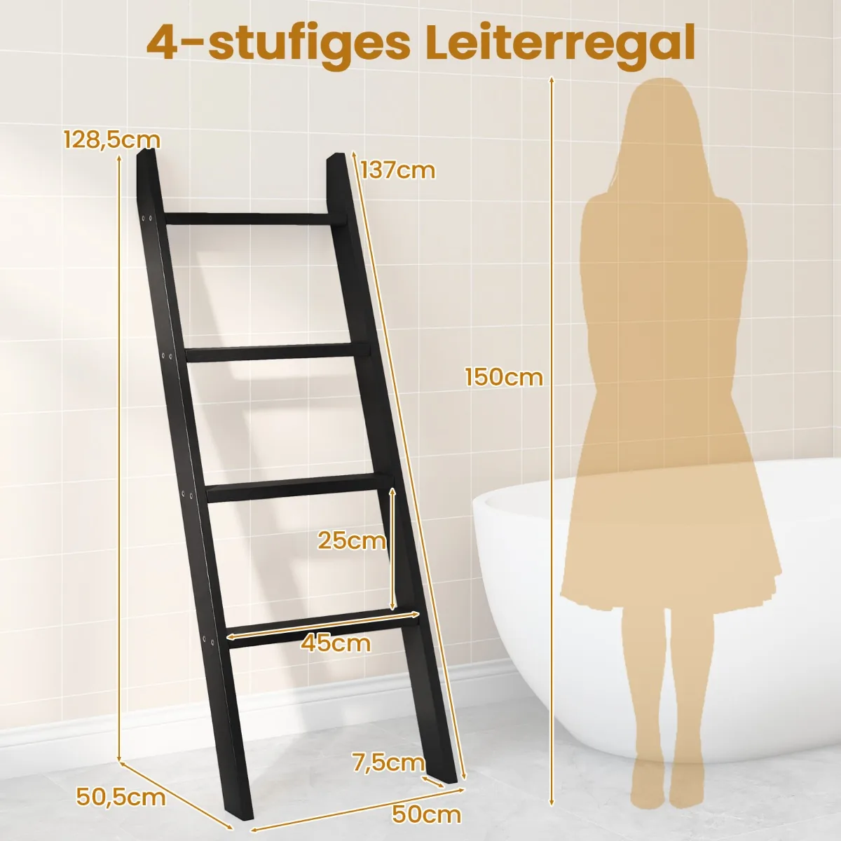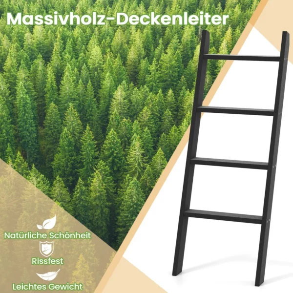Rankšluosčių kabykla 50×7,5x137cm juodos spalvos yra praktiškas sprendimas vonios kambariui ar kitoms patalpoms. Ši keturių pakopų kopėčių lentyna padeda sutaupyti vietos ir patogiai laikyti rankšluosčius, antklodes ar asmenines priežiūros priemones.