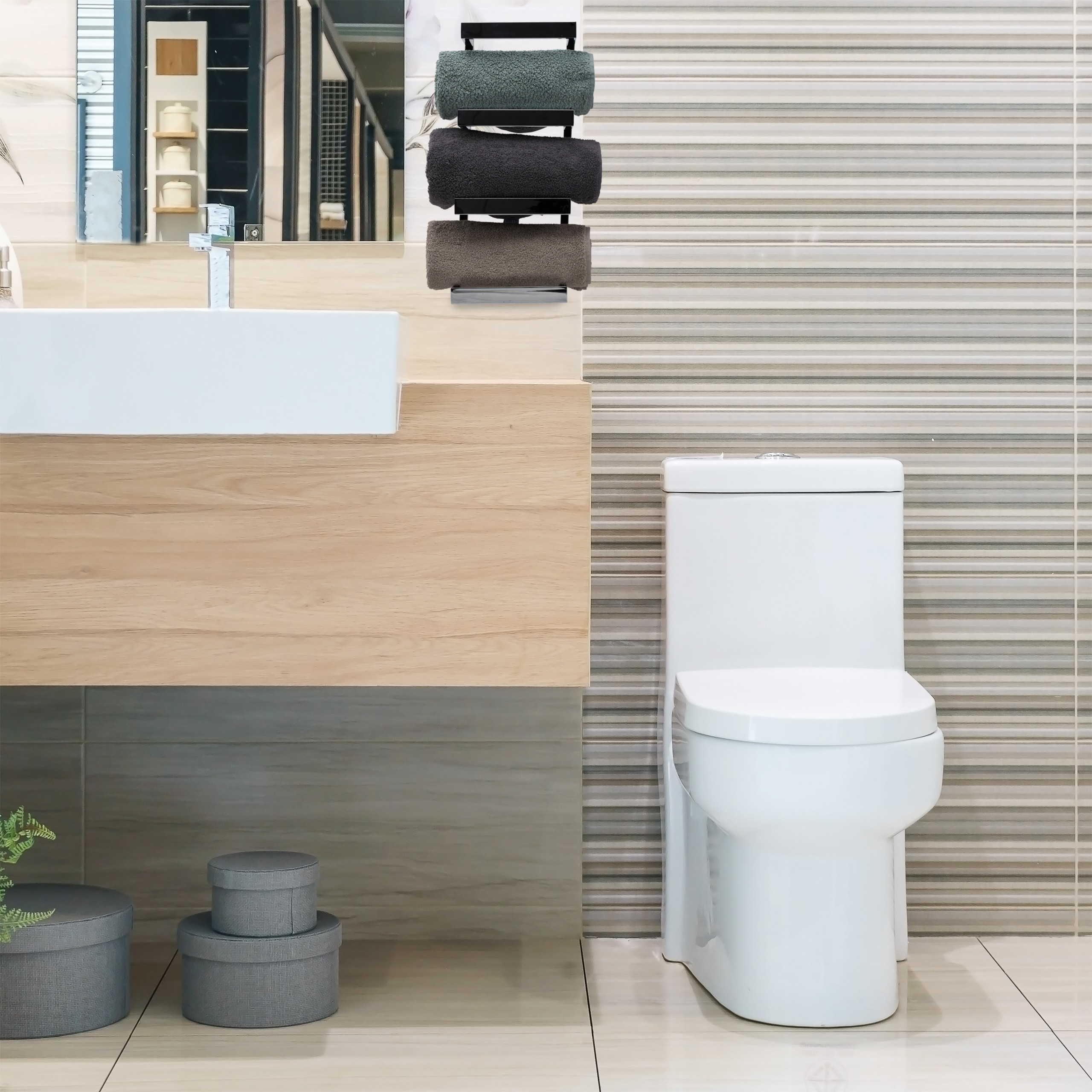 Šis rankšluosčių laikiklis ne tik puikiai atlieka savo funkciją, bet ir tampa stilingu akcentu jūsų vonios kambaryje. Kai rankšluosčiai yra tvarkingai suvynioti ir padėti ant lentynų, jų spalvos suteikia papildomą gyvybingumą ir jaukumą jūsų erdvei.