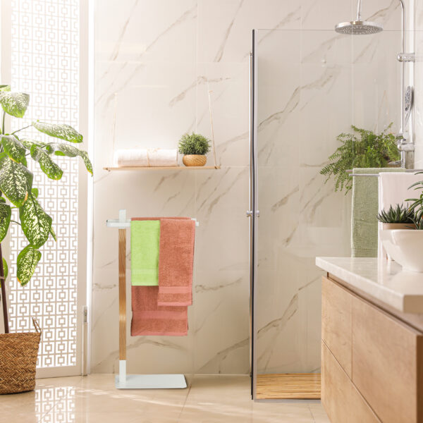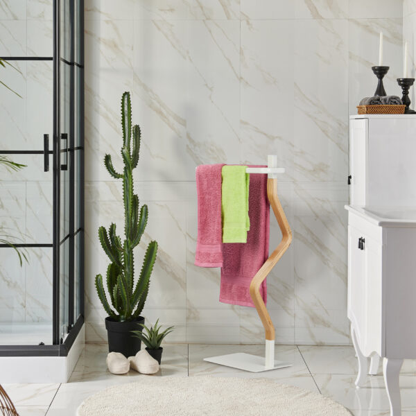- Laisvas pastatymas: Rankšluosčių stovas gali būti pastatytas bet kurioje kambario vietoje, todėl nereikia gręžti skylių į vonios plyteles.