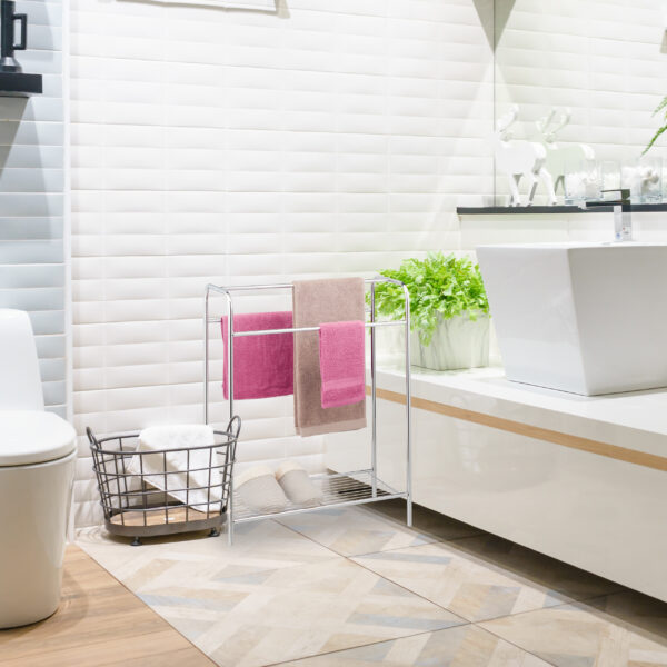 Pasirinkite šį rankšluosčių stovą ir mėgaukitės ne tik jo estetika, bet ir praktiškumu, kuris palengvins jūsų kasdienę rutiną vonios kambaryje.