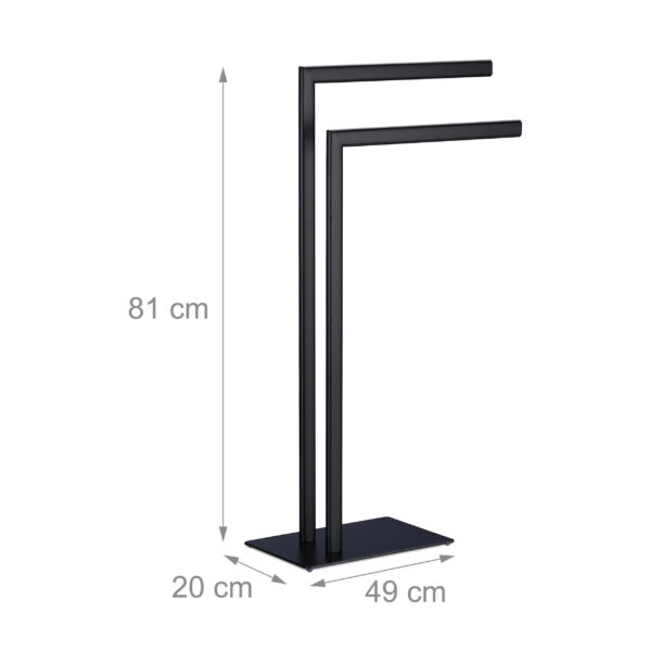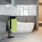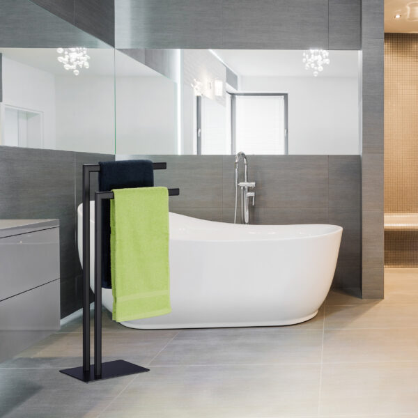 Pristatome elegantišką ir funkcionalų juodos spalvos vonios rankšluosčių stovą, kuris taps puikiu akcentu jūsų vonios kambaryje. Šis šiuolaikinio dizaino rankšluosčių laikiklis ne tik suteiks jūsų erdvei modernumo, bet ir užtikrins patogų rankšluosčių laikymą bei džiovinimą.