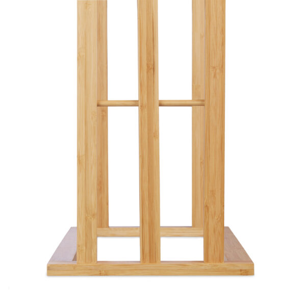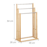 Pristatome elegantišką ir funkcionalų rankšluosčių stovą, kuris taps puikiu akcentu jūsų vonios kambaryje ar virtuvėje. Šis stovas, pagamintas iš tvaraus bambuko, pasižymi natūraliu dizainu, kurį papildo blizgantys metaliniai strypai, suteikiantys ypatingo elegantiškumo.