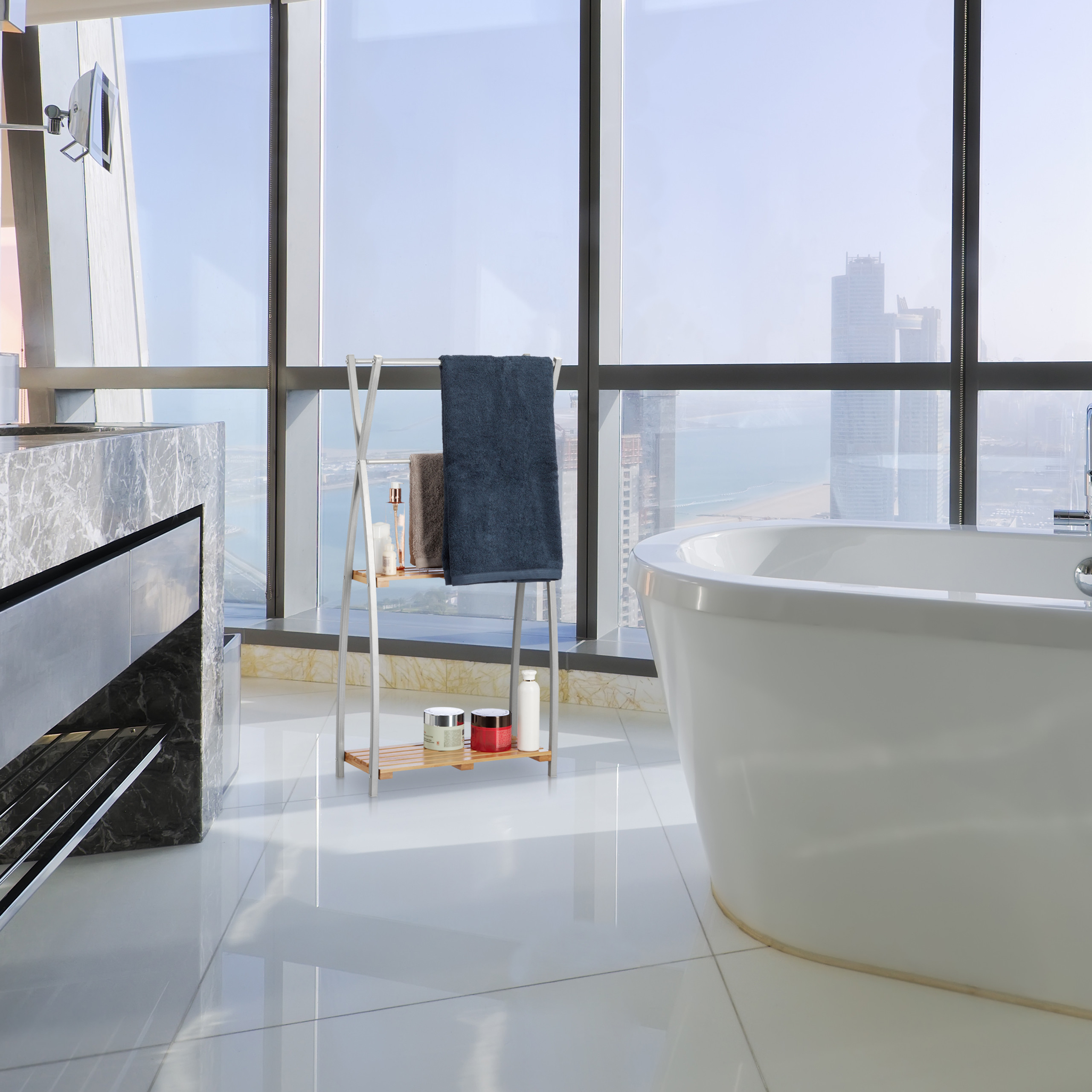 Šis rankšluosčių stovas yra ne tik funkcionalus, bet ir dekoratyvus elementas, kuris suteiks jūsų vonios kambariui papildomo žavesio. Vidurinis bėgelis puikiai tinka mažesniems rankšluosčiams ir skalbimo šluostėms, užtikrinant, kad viskas būtų tvarkingai sudėta ir lengvai pasiekiama.