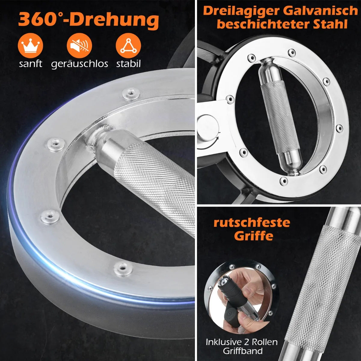 - Cinkuotos metalinės rankos su neslystančiomis rankenomis užtikrina saugumą ir komfortą treniruočių metu.