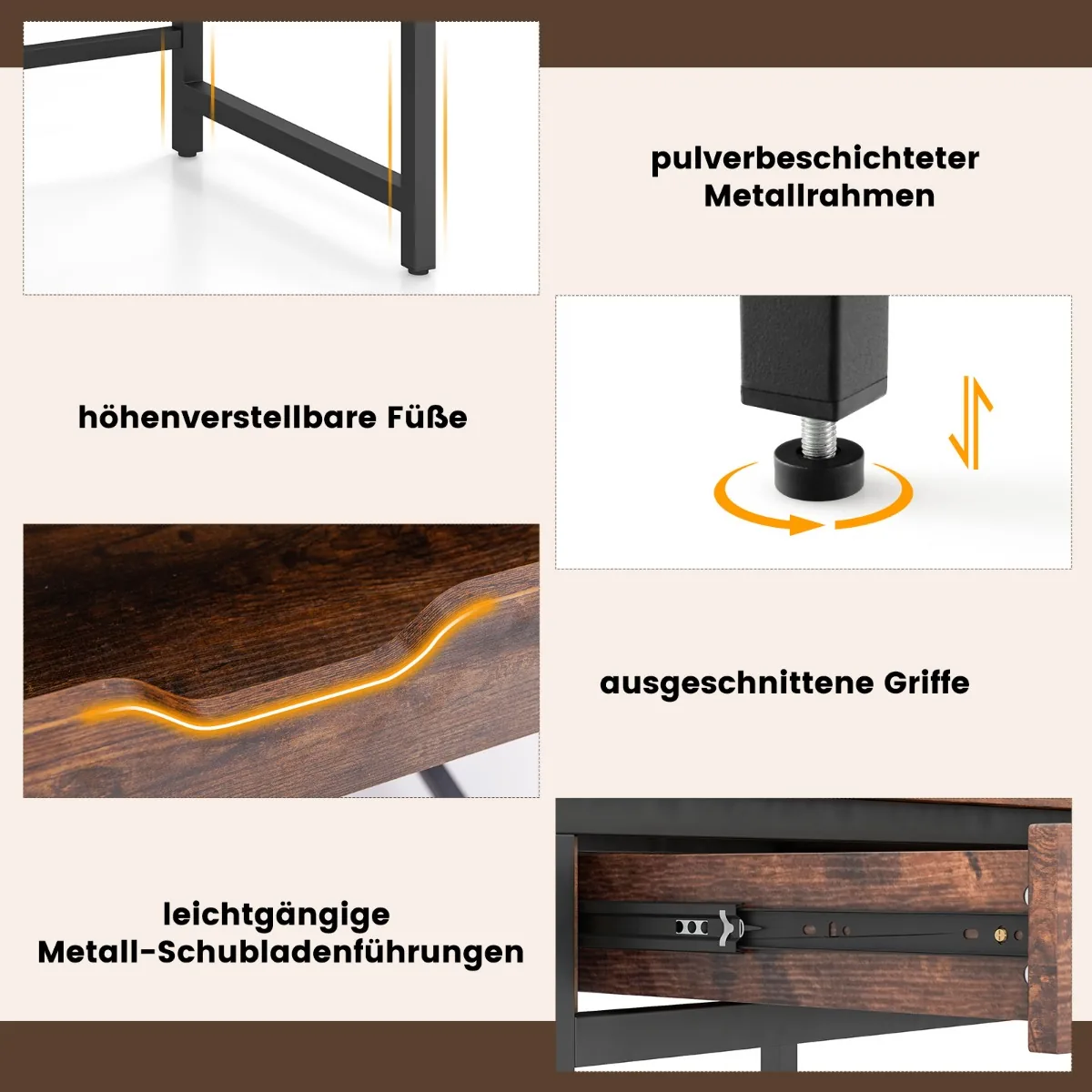 - Ištraukiamas stalčius sklandžiai slysta ir talpina biuro reikmenis.