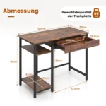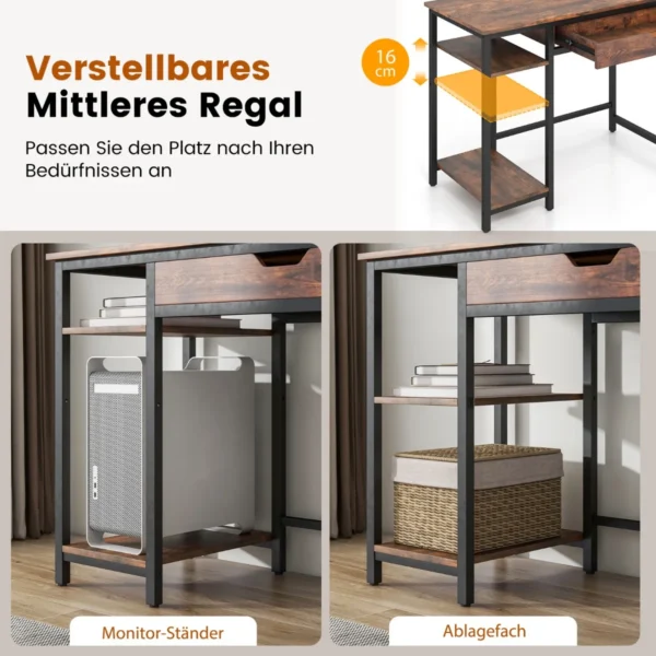 Rašomasis stalas 100x50x76 cm, rudos ir juodos spalvos, skirtas optimizuoti darbo erdvę namuose ar biure. Šis kompiuterio stalas turi erdvų stalviršį, ištraukiamą stalčių bei reguliuojamą lentyną, leidžiančią prisitaikyti prie individualių poreikių.